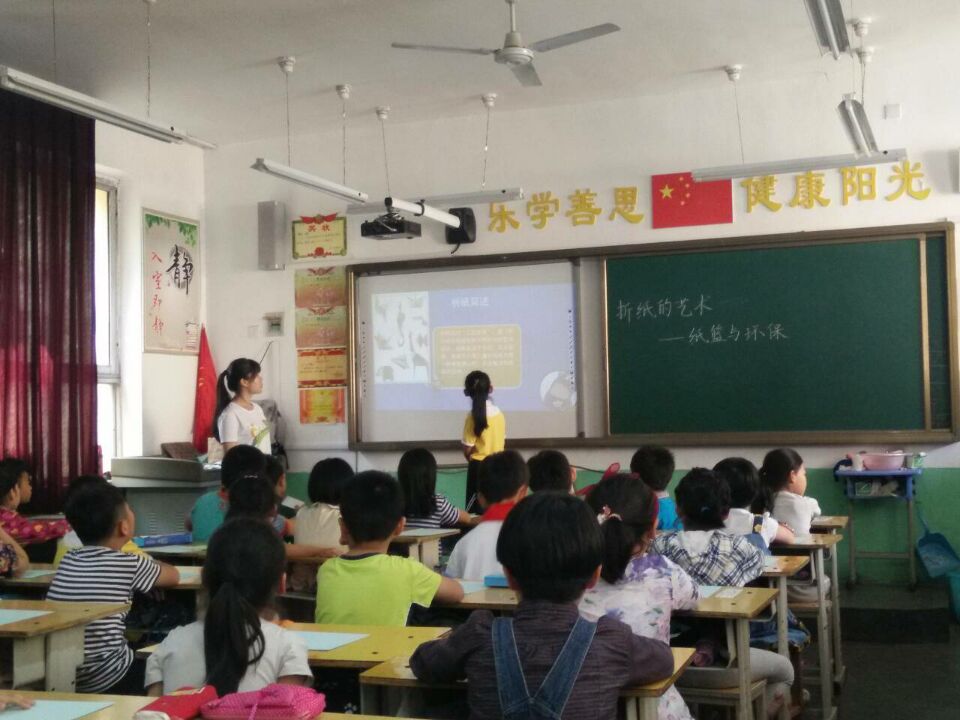 麦田支教老师以“纸与环境”为主线贯穿课堂,引领小学生们进入了折纸的神秘世界。通过精彩的PPT展示,小学生们了解到了折纸的来源、纸的几种折法、废纸的危害和环保的重要性。支教老师用通俗易懂又不失生动活泼的语言将折纸的魅力娓娓道来,使课堂氛围渐入佳境。随后,支教老师引导小学生们从简单的折纸篓开始,让他们亲手实践,在学习中收获乐趣,在玩耍中获得成长。小学生们也对这堂课抱有极大的兴趣,争先恐后地展示自己的作品、回答老师提出的问题,跟他人一起分享快乐、分享心得,一度将课堂氛围推向了高潮。张艺轩同学甚至主动走上讲台向同学们展示了自己的作品,赢得了学生和老师们的阵阵掌声。