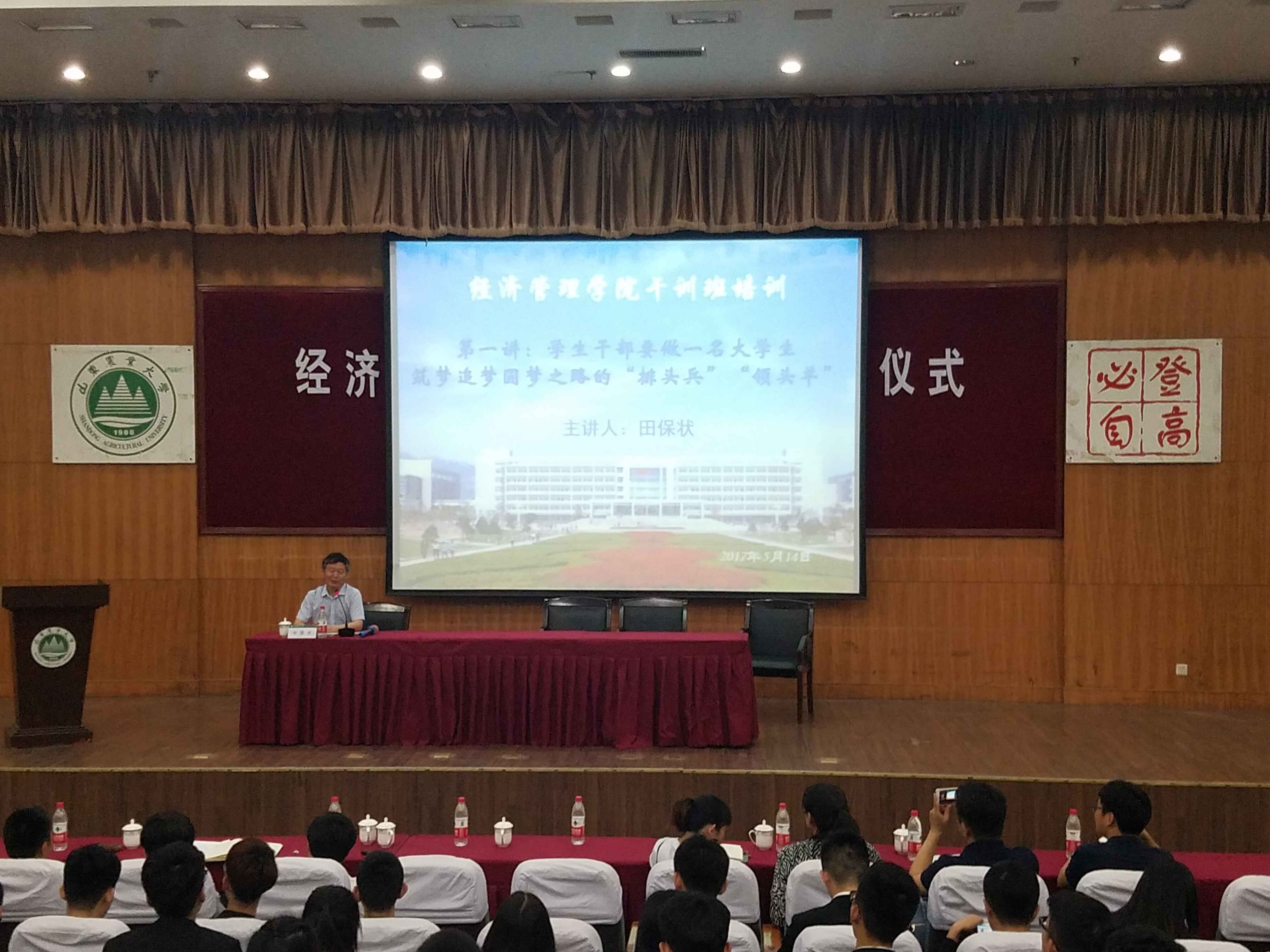 5月14日,大神28预测网站2017年“干训班”开班仪式在南校区第一学术报告厅举办,学校离退休处处长田保状、学校团委副书记王利、大神28预测网站党委副书记齐清、大神28预测网站全体辅导员老师及400余名学生干部参加启动仪式,仪式结束后,田保状为“干训班”作了首场培训。