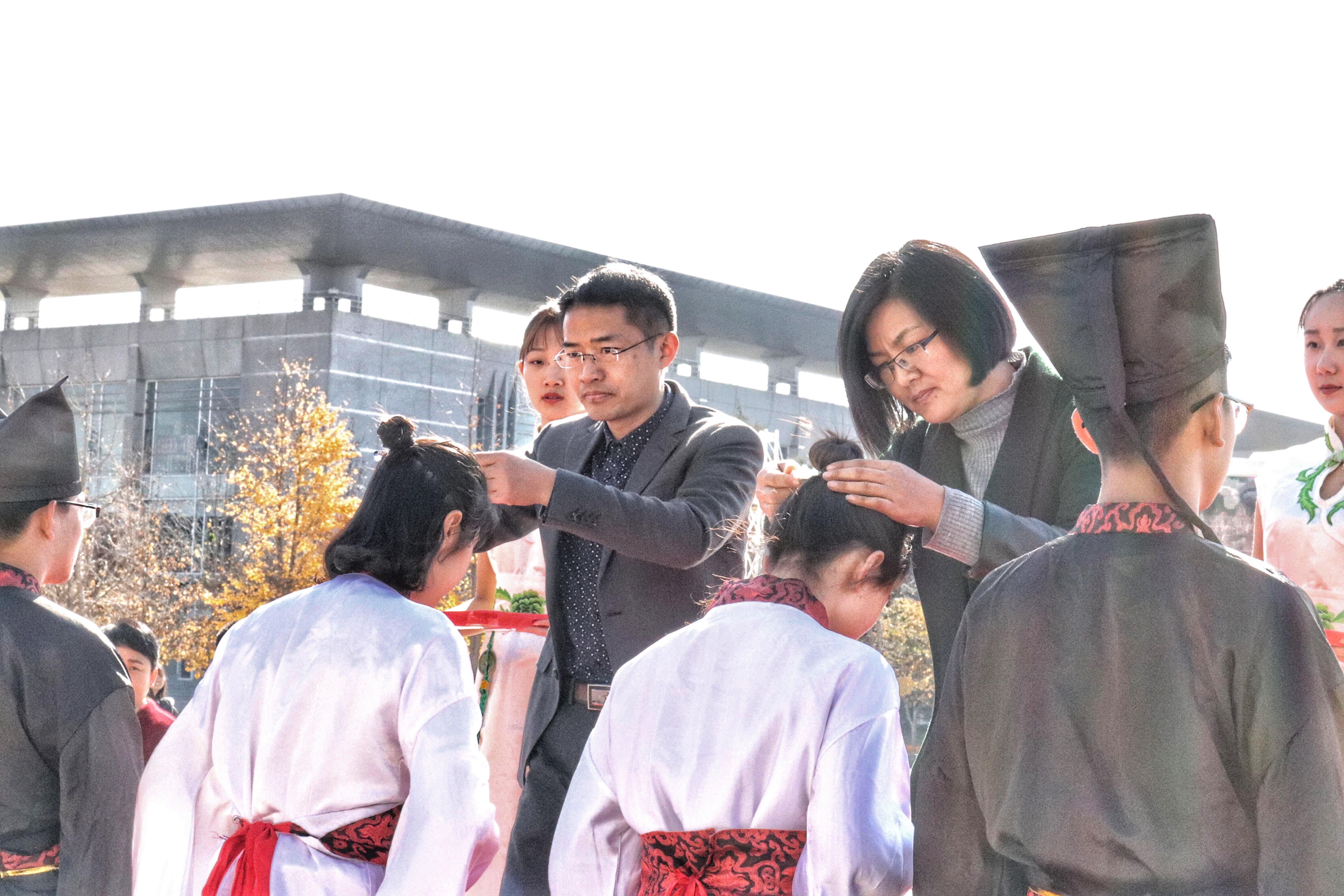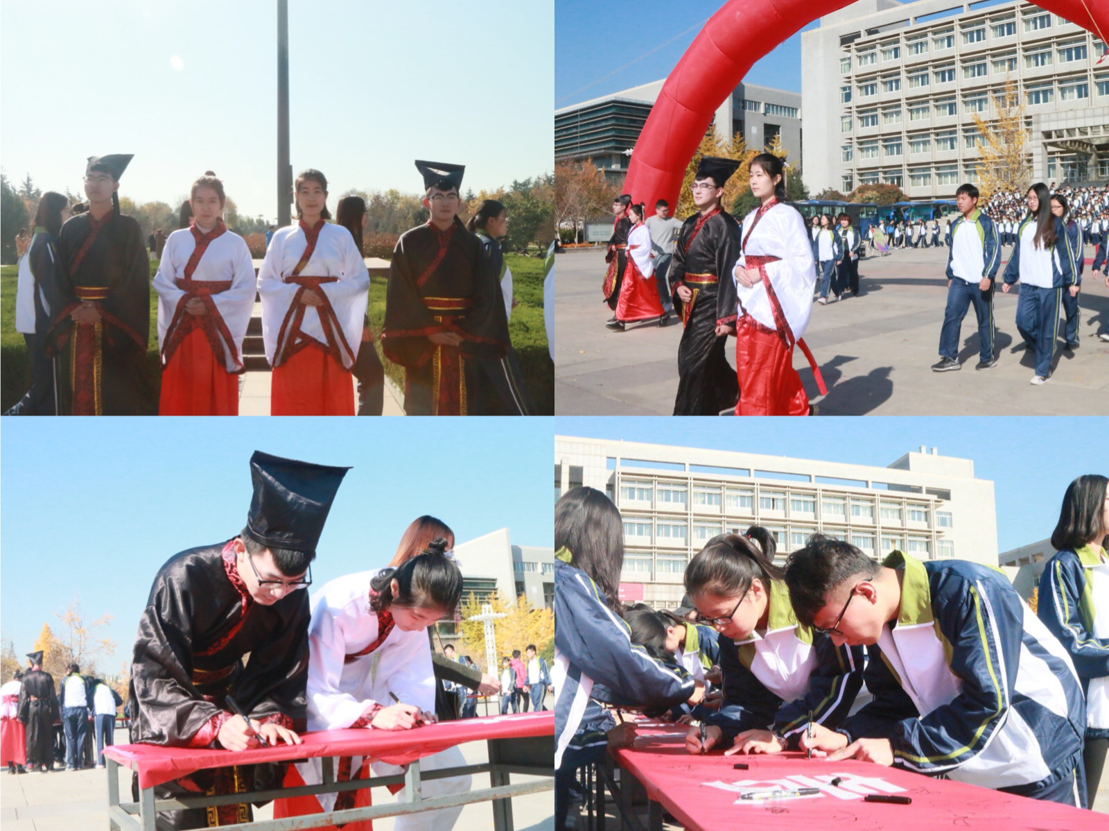 2017级学生代表身着汉服,接受魏立政等师长的加冠加钗,行正规拜礼,聆听师长教诲。新生代表的朗诵《岱下青春》表达了同学们积极向上,努力奋斗的心声。王群老师劝勉同学们要用信念导航人生,用执着追求梦想,用双肩扛起自己的未来。全体同学集体宣誓,穿过成人门,在横幅上郑重地签上了自己的名字,将告别天真,以无限的激情步入成年的新阶段。