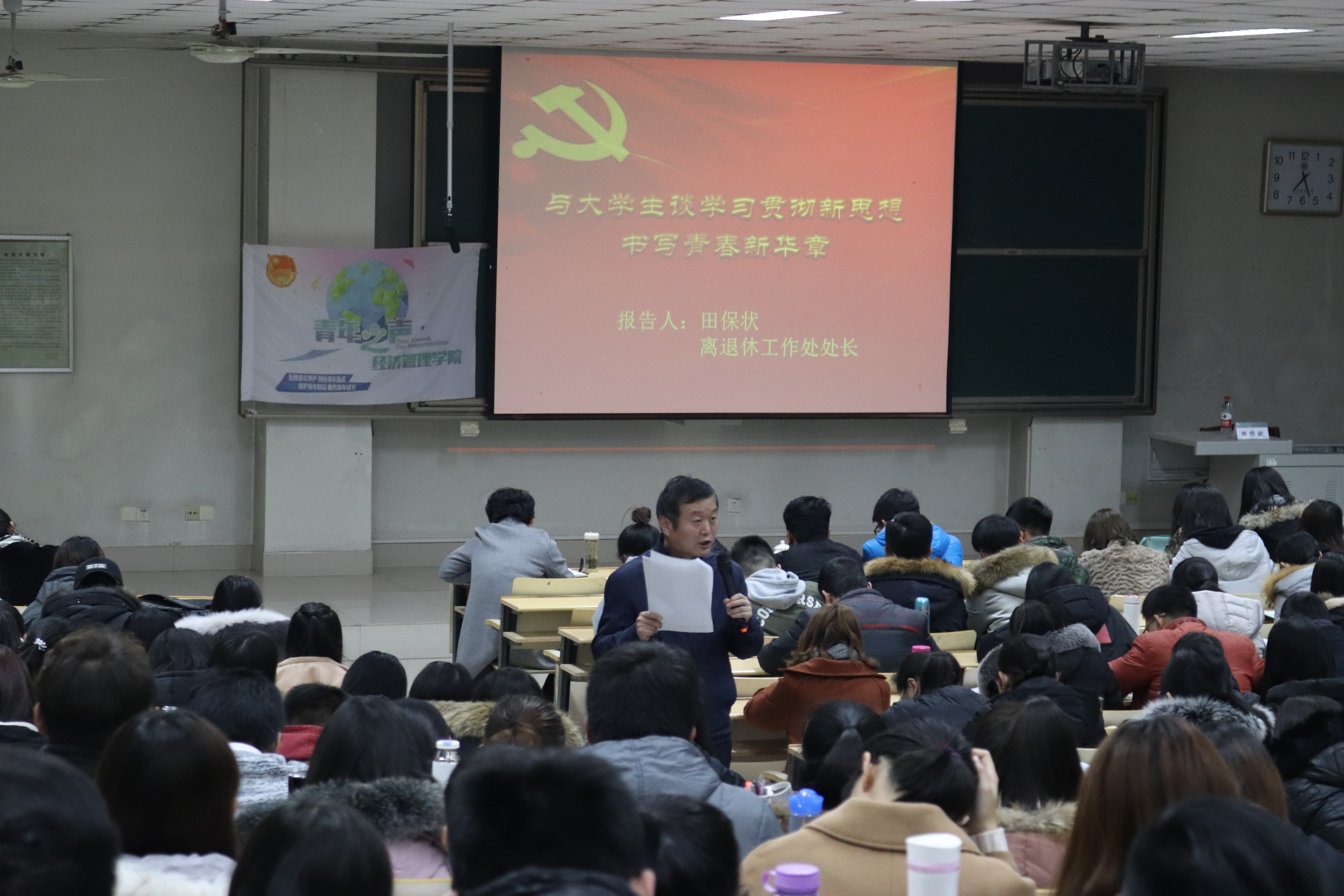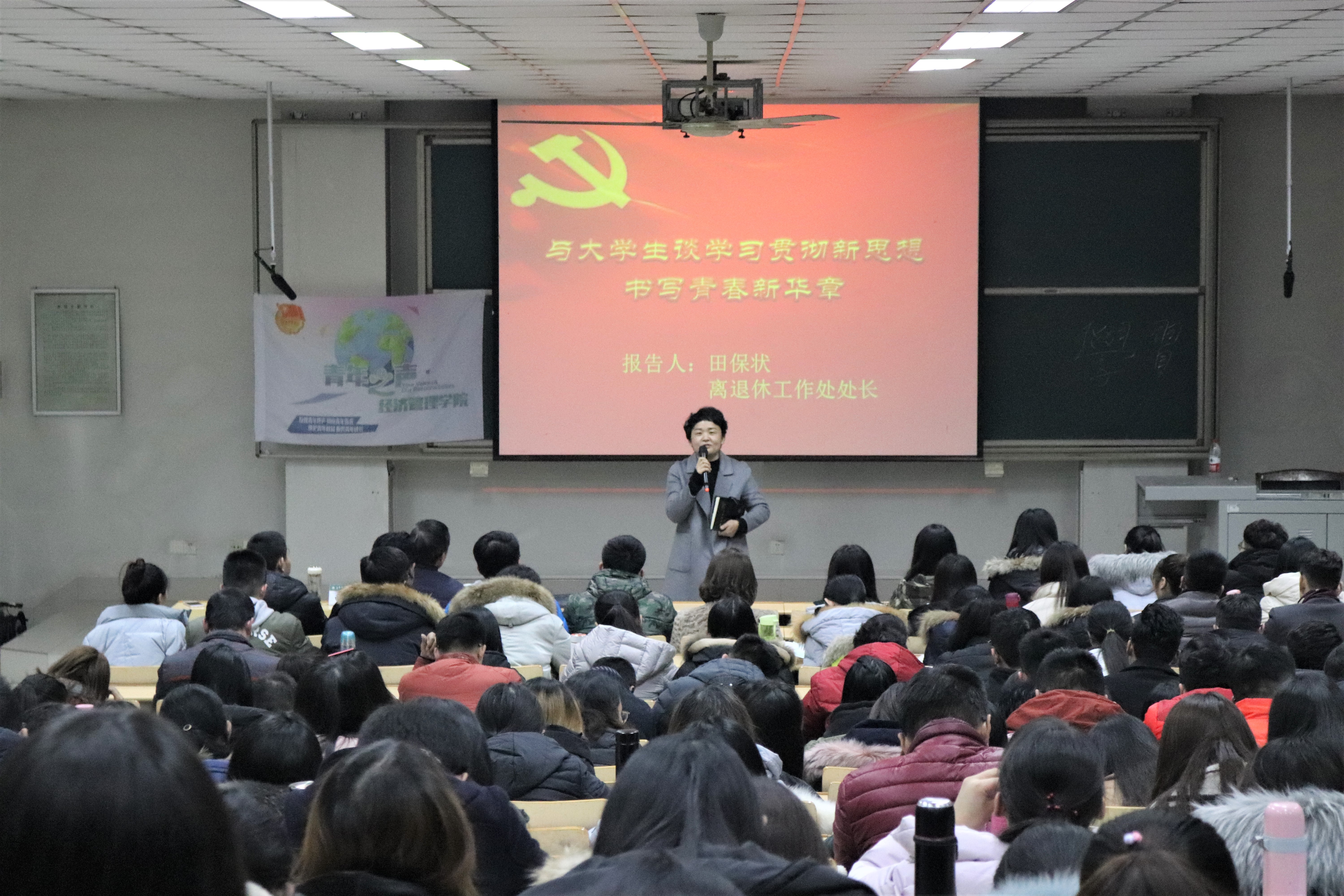 12月14日,离退休工作处处长田保状老师为经管学子作题为“与大学生谈学习贯彻新思想,书写青春新华章”的专题报告会。学院党委副书记齐清老师和团委老师,以及学生党员、入党积极分子和主要学生干部参加了本次报告会。