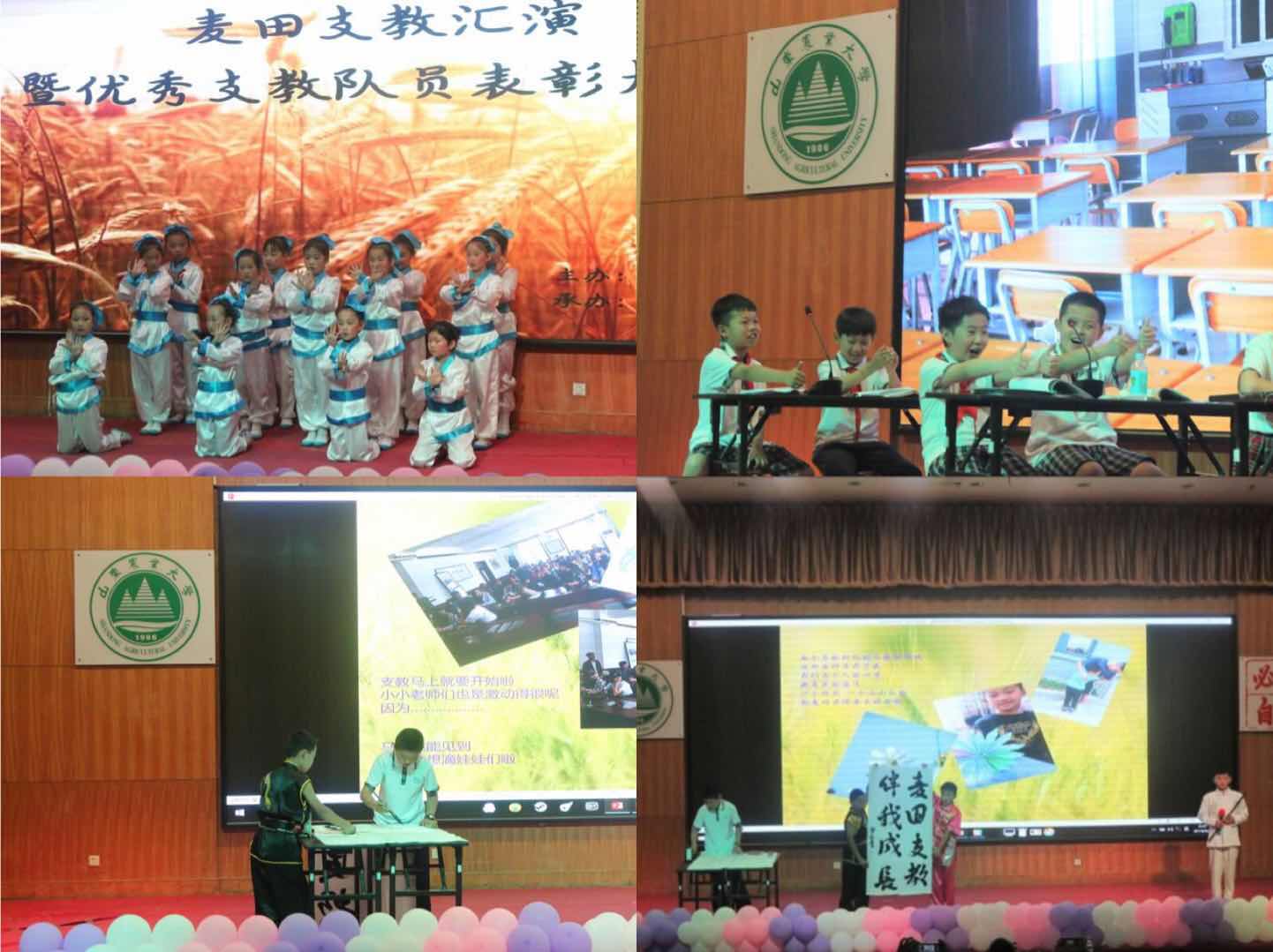 汇演在结庄小学带来的《武林风》中拉开帷幕,响亮整齐的口号,激昂向上的精神,强劲有力的武姿,充分展现武术雄风;岱庙实验学校小朋友们的唐诗联唱,创新性地将古诗用新颖的形式表达出来,韵味深长;支教老师和小朋友们带来的话剧《七彩课堂》节奏欢快,充满童趣,赢得观众的笑声不断,掌声连连。结庄小学小朋友的现场书法“麦田支教,伴我成长”表达了大学生支教对小朋友成才发展的重要意义,也为本次汇演画上圆满的句号。