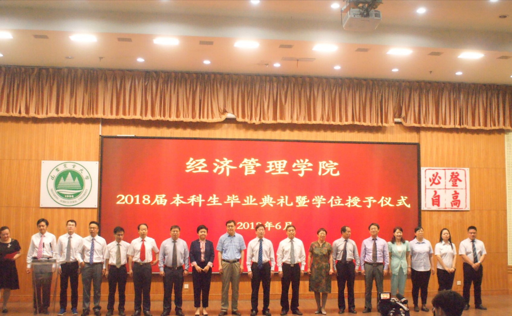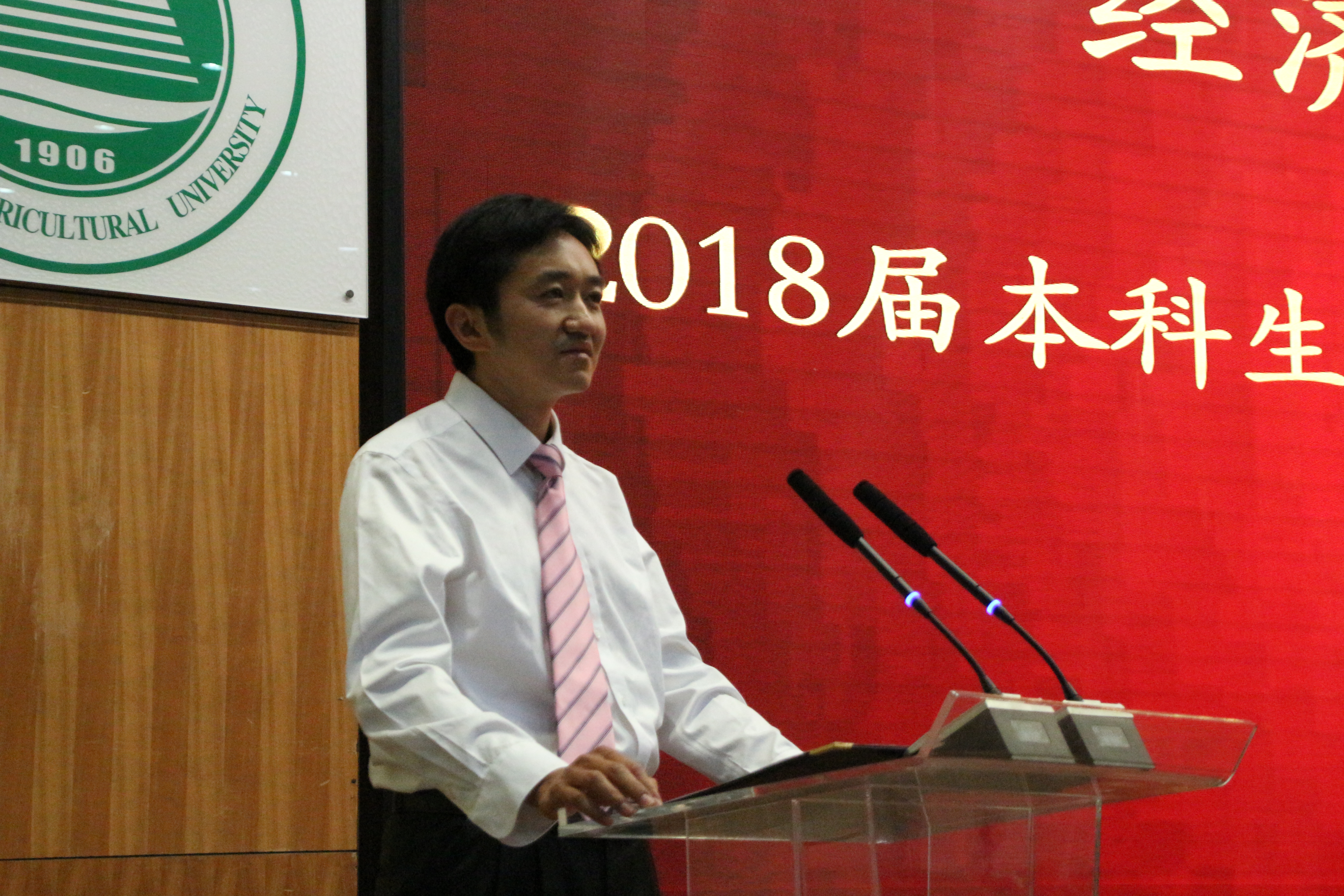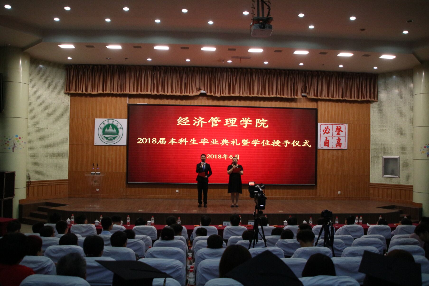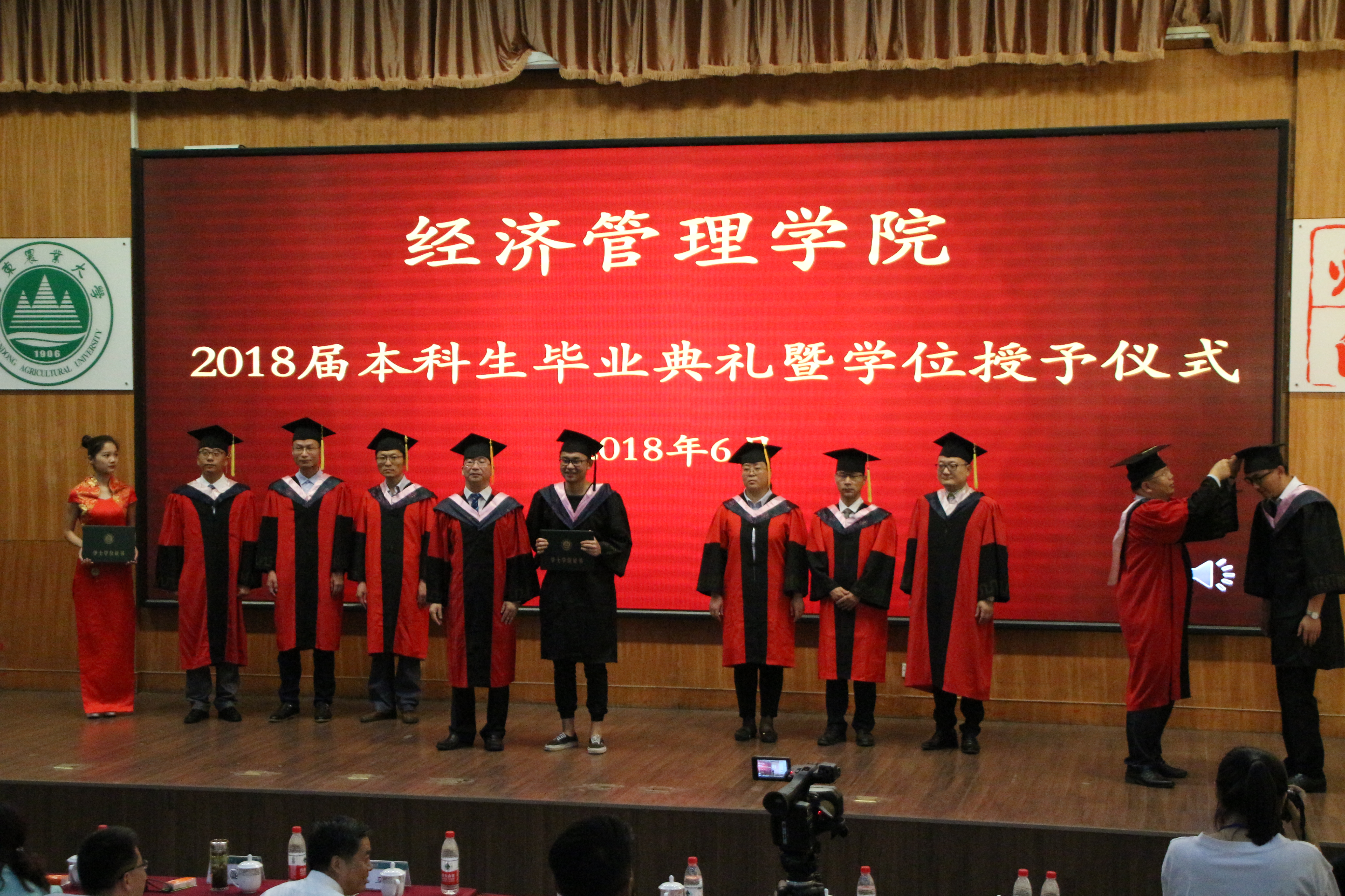 典礼开始,全体起立,奏唱国歌。院长陈盛伟首先致辞,他对本届毕业生取得的成绩表示肯定,并希望同学们有感恩农大的心怀,保持对学校、对自己的自信;嘱托毕业生要坚持四十五度角昂望星空的人生态度,不随波逐流;期待同学们能将这所大学的文化和价值,传遍世界各个角落。接着,教师代表王骞发言,他对2018届毕业生表示祝贺,用庄重而不失幽默的语言向毕业生们寄予深切嘱托,希望经管学子能在以后的人生路上走得更远,飞得更高。随后,党委书记魏立政与院长陈盛伟分别为优秀毕业生代表颁奖、为校友联络员代表颁发聘书。最后,记录着大家点滴生活的视频《我们的岁月》,深情款款的毕业生朗诵《别离日历》,展示出专属于毕业生们的岁月,瞬间引起了师生的共鸣,勾起了他们关于大学的回忆,使不少人流下了眼泪。