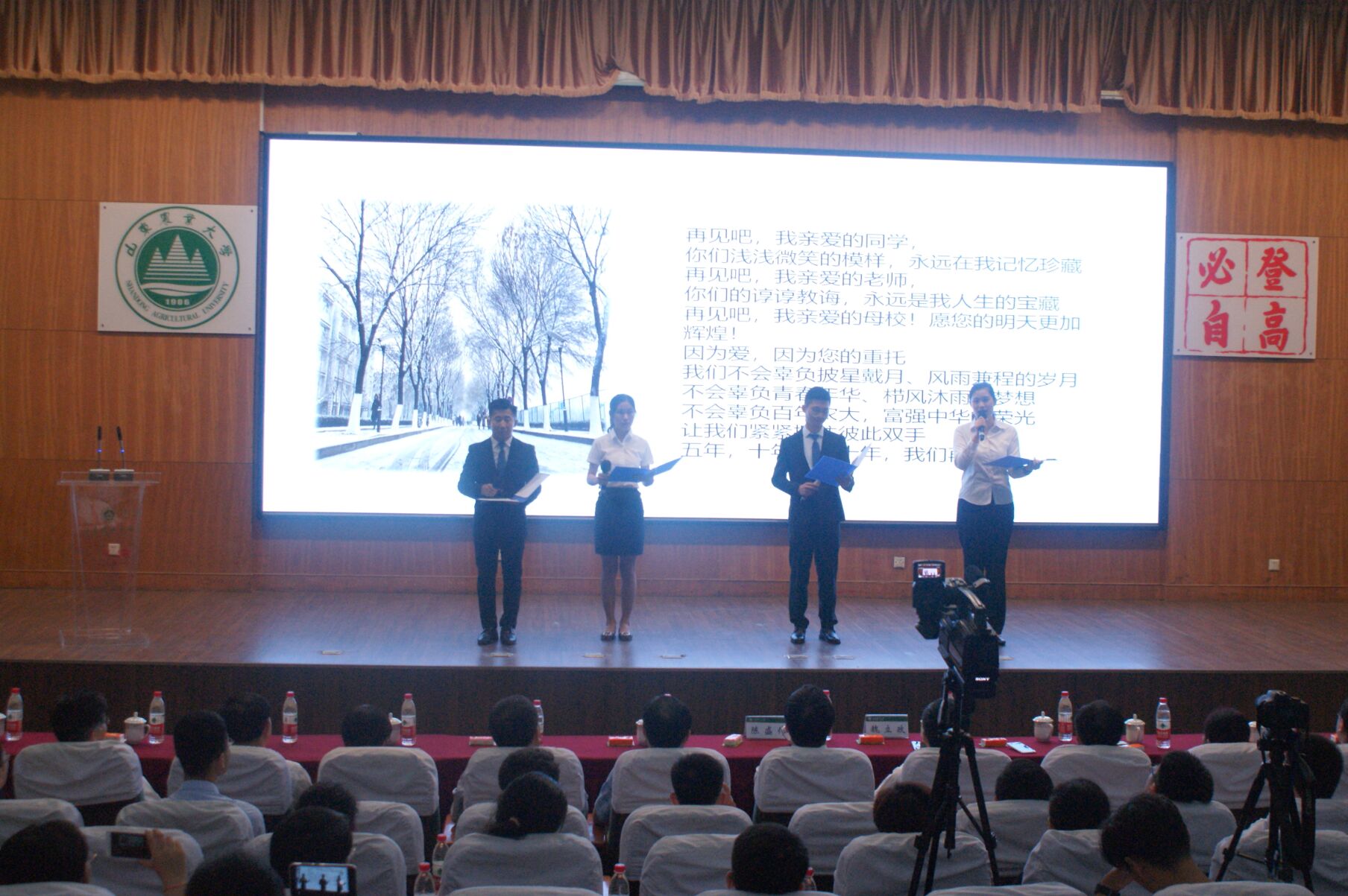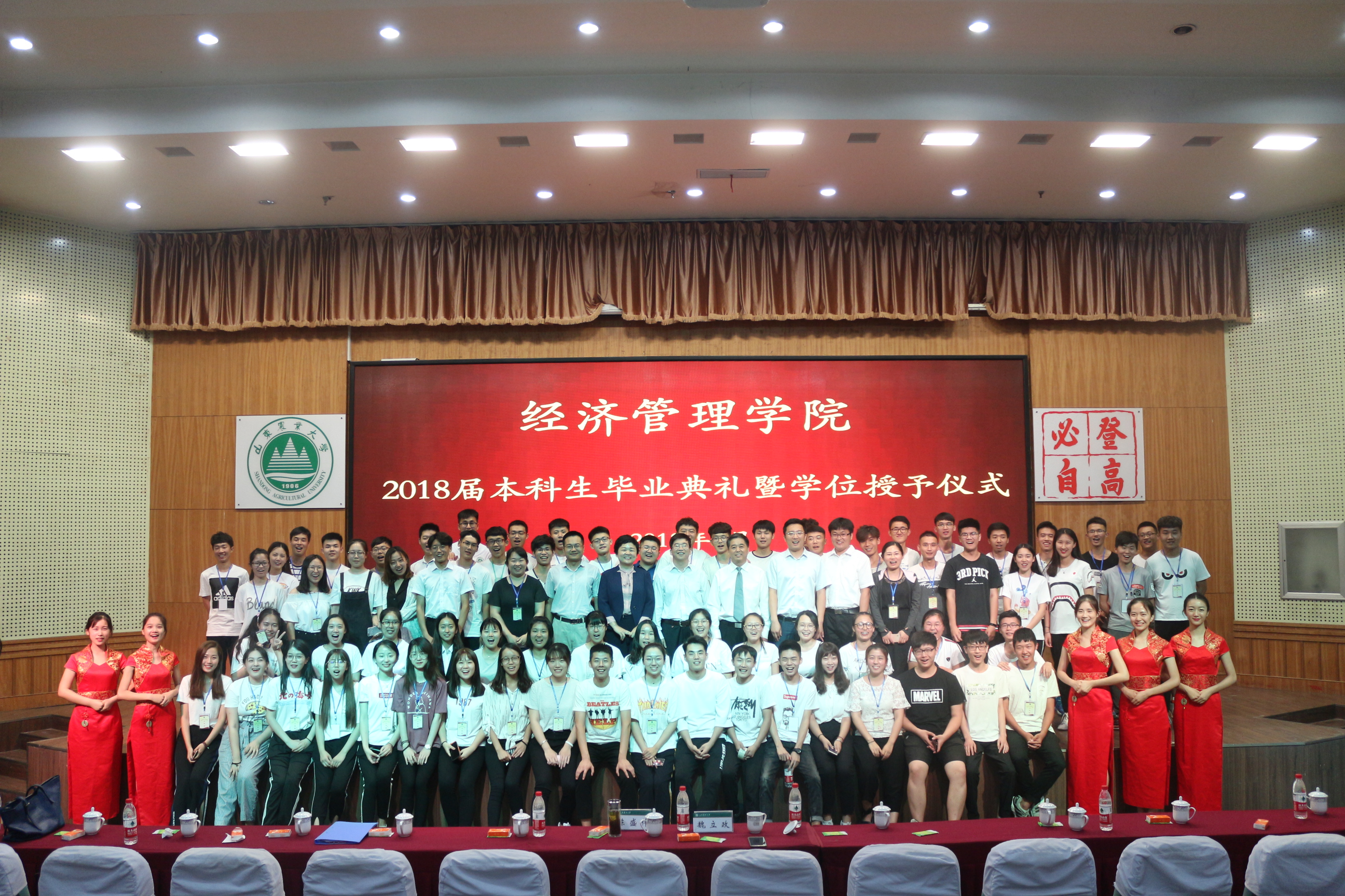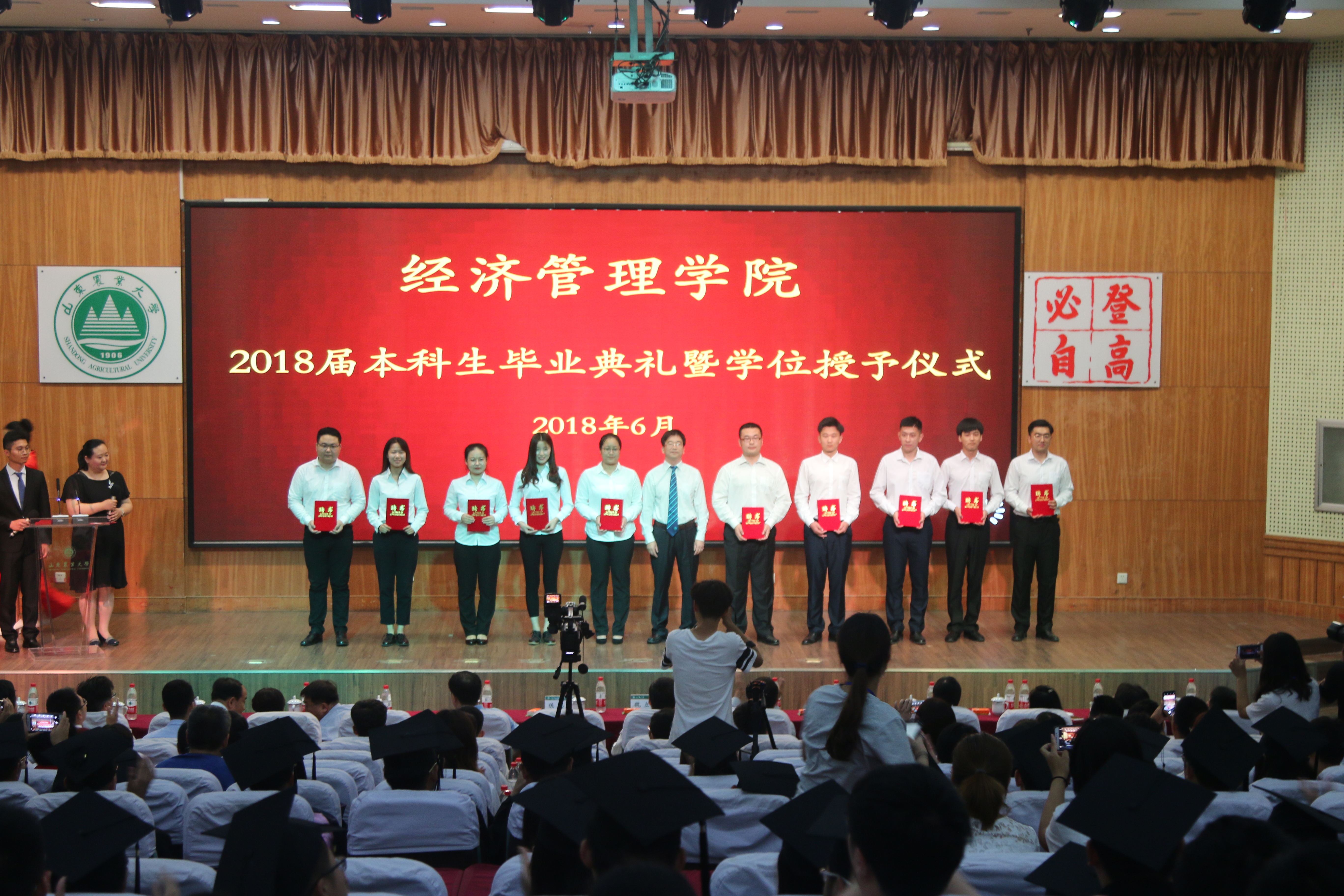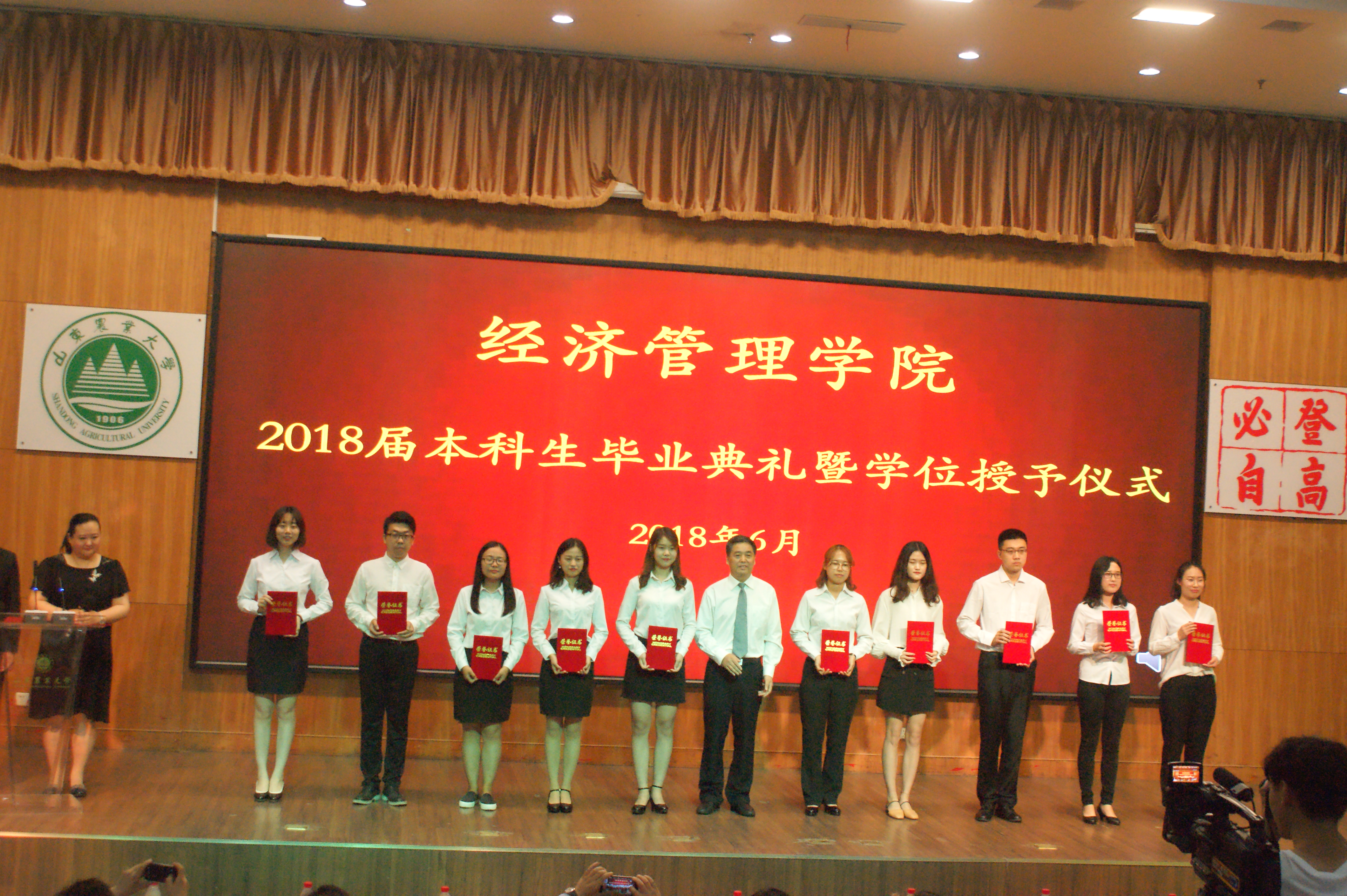 典礼开始,全体起立,奏唱国歌。院长陈盛伟首先致辞,他对本届毕业生取得的成绩表示肯定,并希望同学们有感恩农大的心怀,保持对学校、对自己的自信;嘱托毕业生要坚持四十五度角昂望星空的人生态度,不随波逐流;期待同学们能将这所大学的文化和价值,传遍世界各个角落。接着,教师代表王骞发言,他对2018届毕业生表示祝贺,用庄重而不失幽默的语言向毕业生们寄予深切嘱托,希望经管学子能在以后的人生路上走得更远,飞得更高。随后,党委书记魏立政与院长陈盛伟分别为优秀毕业生代表颁奖、为校友联络员代表颁发聘书。最后,记录着大家点滴生活的视频《我们的岁月》,深情款款的毕业生朗诵《别离日历》,展示出专属于毕业生们的岁月,瞬间引起了师生的共鸣,勾起了他们关于大学的回忆,使不少人流下了眼泪。