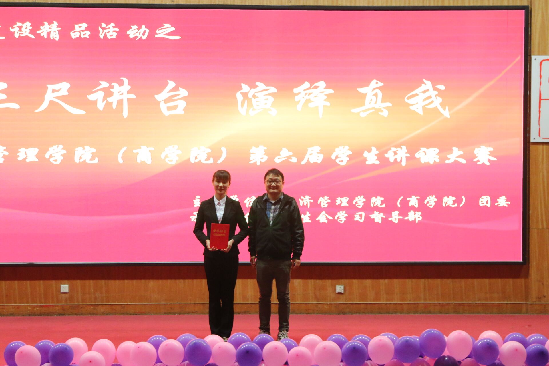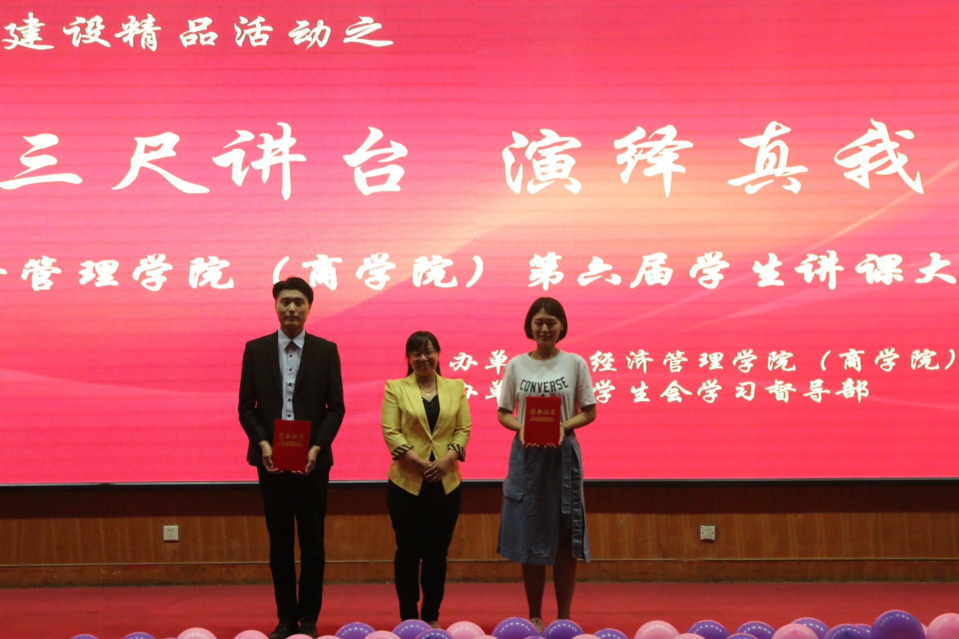 经过初赛、复赛的层层选拔,最终有6支参赛队伍凭借出色的表现顺利进入决赛。比赛环节中,各参赛队伍通过PPT展示和情景表演,将难以理解的公式和理论转化为通俗易懂的内容。“诗词滥用误用现象”、“自由之光”、“中国味道”、“致敬环卫工人”等讲课主题被各班级参赛队伍以情景表演和朗诵的方式演绎的淋漓尽致,几度将现场气氛推向高潮。经济七班代表队主讲与助讲同学配合默契,为大家讲解了校园安全防范攻略。工商八班的“都挺好”以京杭运河为主线,带着观众由北到南领略魅力运河文化,领略中国味道。最终,工商八班“都挺好”团队技高一筹,夺得此次讲课大赛冠军。