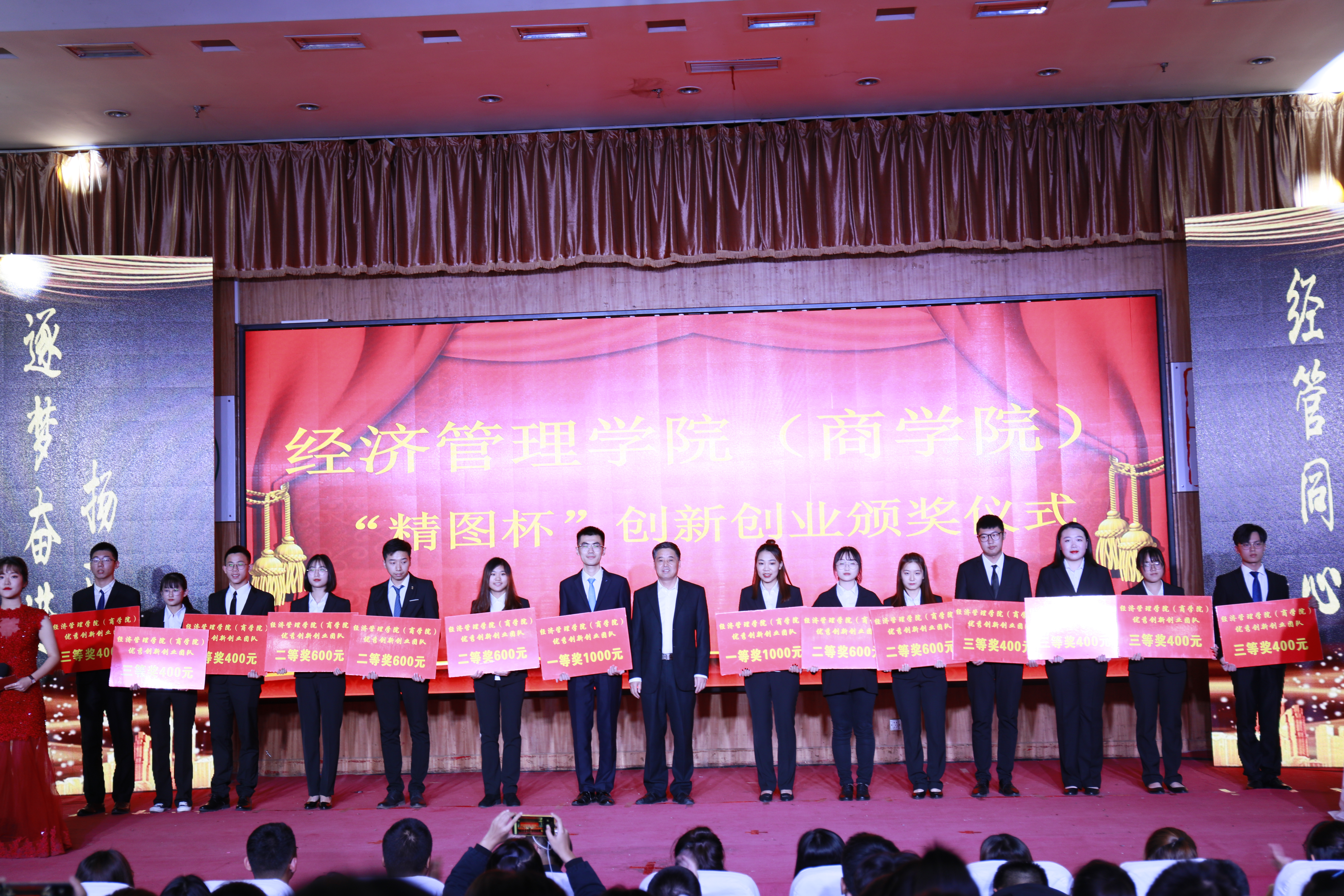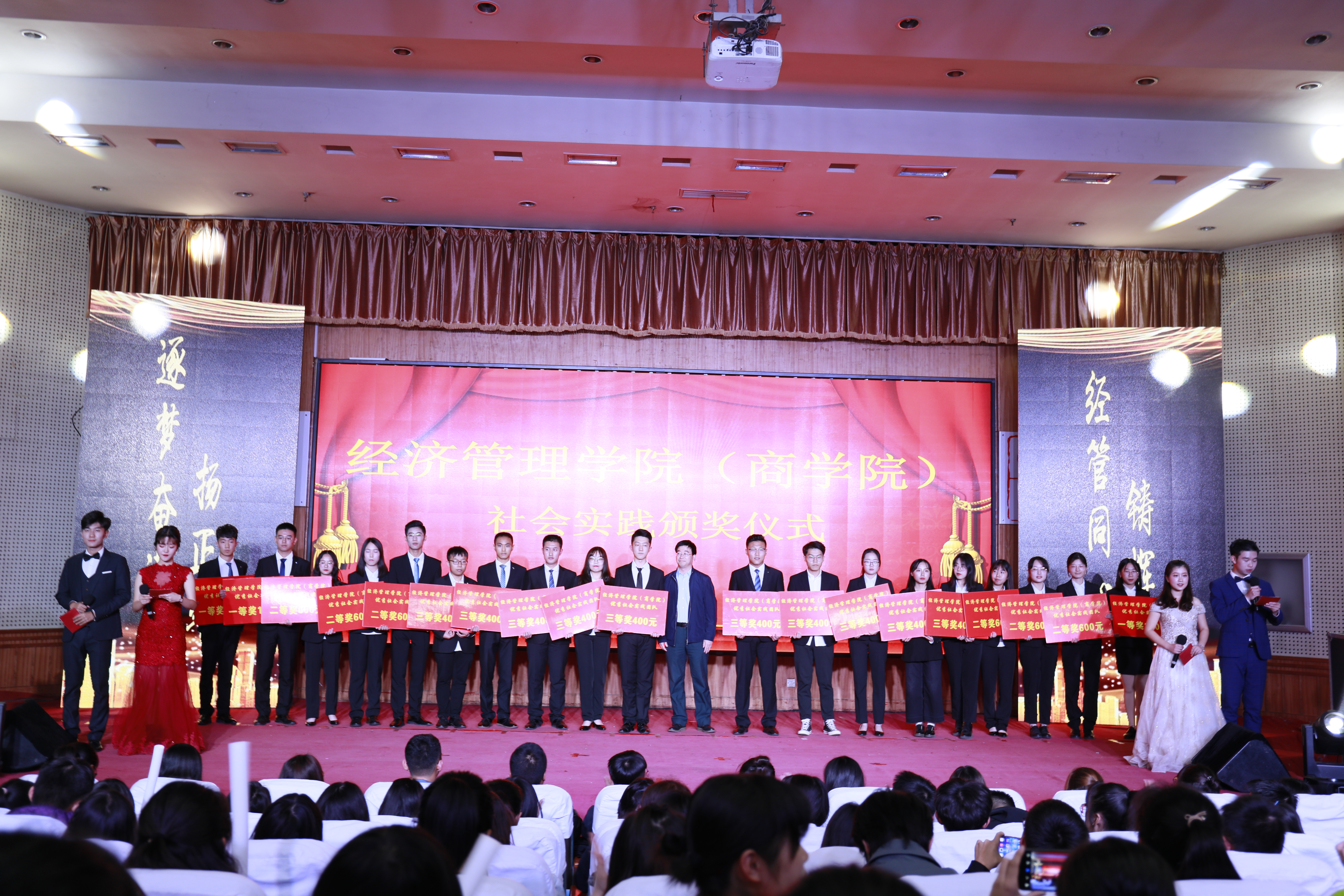现场播放了学院宣传片《弄潮登高》,介绍学院发展历程、辉煌成就和未来规划。现场还举行了优秀社会实践团队、优秀创新创业团队及百优大学生颁奖礼,表彰在社会实践、创新创业等方面表现突出的团队及同学。晚会在《我们都是追梦人》的合唱声中落下帷幕。