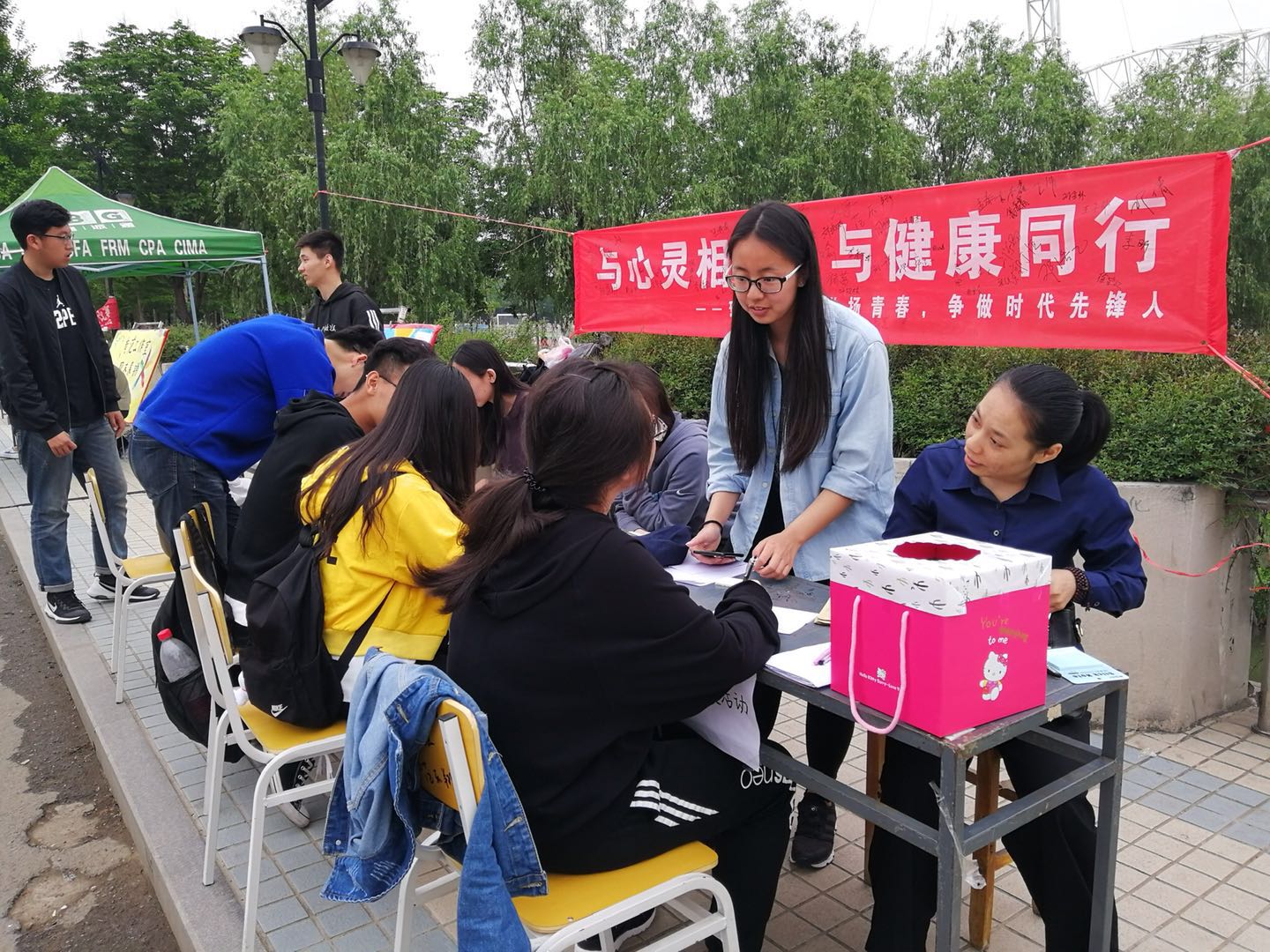 活动分为心理健康知识宣传、心理测试、信件和明信片传递、便利贴张贴等。心理测试分为有霍兰德测试、身份舍弃及“房树人测试”,活动现场,人头攒动,十分热闹,大家对各种心理测试十分好奇,积极跃跃参与。在“给未来的自己”信件传递活动中,很多同学都纷纷拿起笔写下了想对自己说的话,于一年后的自己隔空对话。在明信片传递活动中,参与者写下美好的祝福,留下一份爱,传递一份温暖。