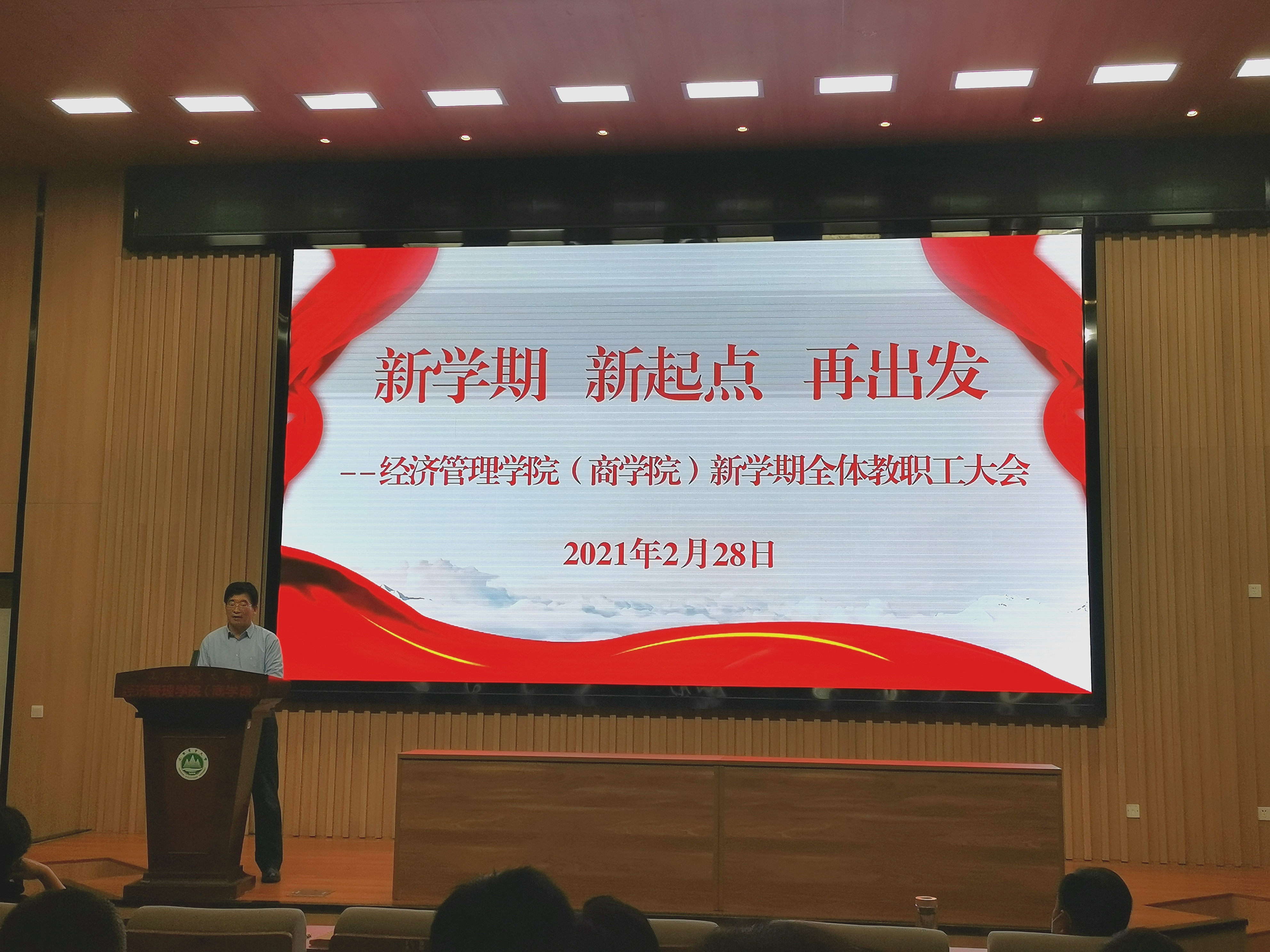 院长陈盛伟对学院假期工作做了简要回顾,总结了2020年取得的成绩,同时对“十四五”及2021年的工作进行了安排部署。新的一年,学院将进一步贯彻新发展理念,从“齐心协力”、“改革创新”、“开放学习”、“交流融合”、“共建共享”五个方面着手,加强师资队伍建设、科研团队建设,做好风险防控,切实担负起新使命,勇担新任务。会上还对其他工作进行了通报与布置。