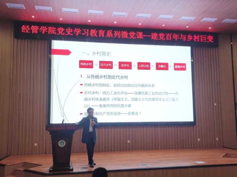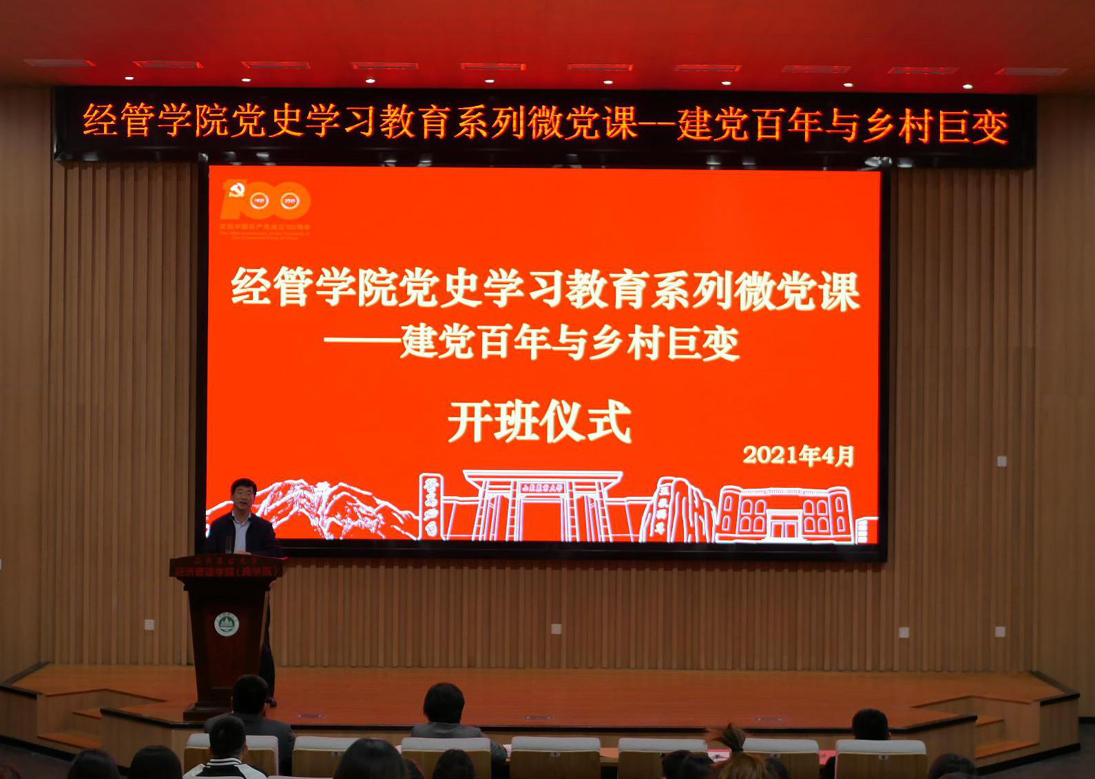 4月14日下午,大神28预测网站党史学习教育系列微党课《建党百年与乡村巨变》正式开课,学院党委书记齐清主持开班仪式,农经系党支部书记徐杰主讲第一期微党课—《从百年党史看百年乡建》,院长陈盛伟全程听课并作总结点评。