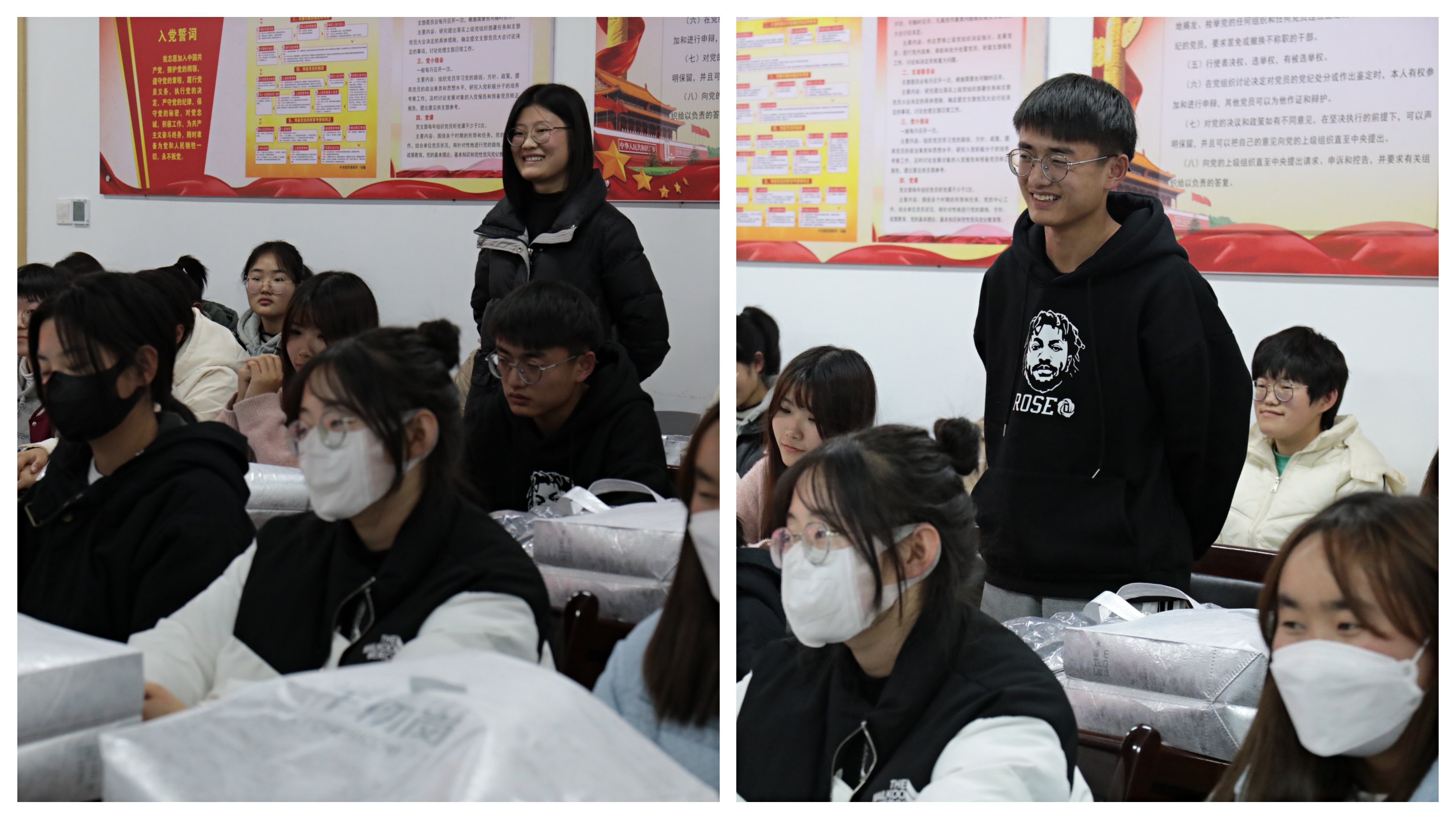 会议伊始,齐清、张安涛两位老师为学生发放爱心羽绒服。张安涛给学生带来部门和老师的关怀和殷切的希望,希望同学们克服生活中的困难,珍惜美好的大学时光,自立自强、努力学习,用知识改变命运。