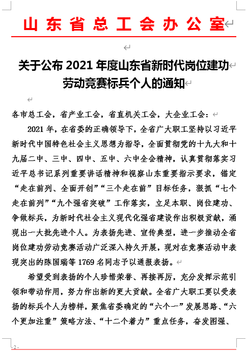 2021年,山东省为贯彻落实习近平新时代中国特色社会主义思想,全面贯彻党的十九大和十九届二中、三中、四中、五中、六中全会精神,认真贯彻落实习近平总书记系列重要讲话精神和视察山东重要指示要求,在教职工中广泛开展了深入持久的岗位建功劳动竞赛活动,涌现出了一大批先进个人。我院崔丙群老师在竞赛活动中表现突出,被评为标兵个人。