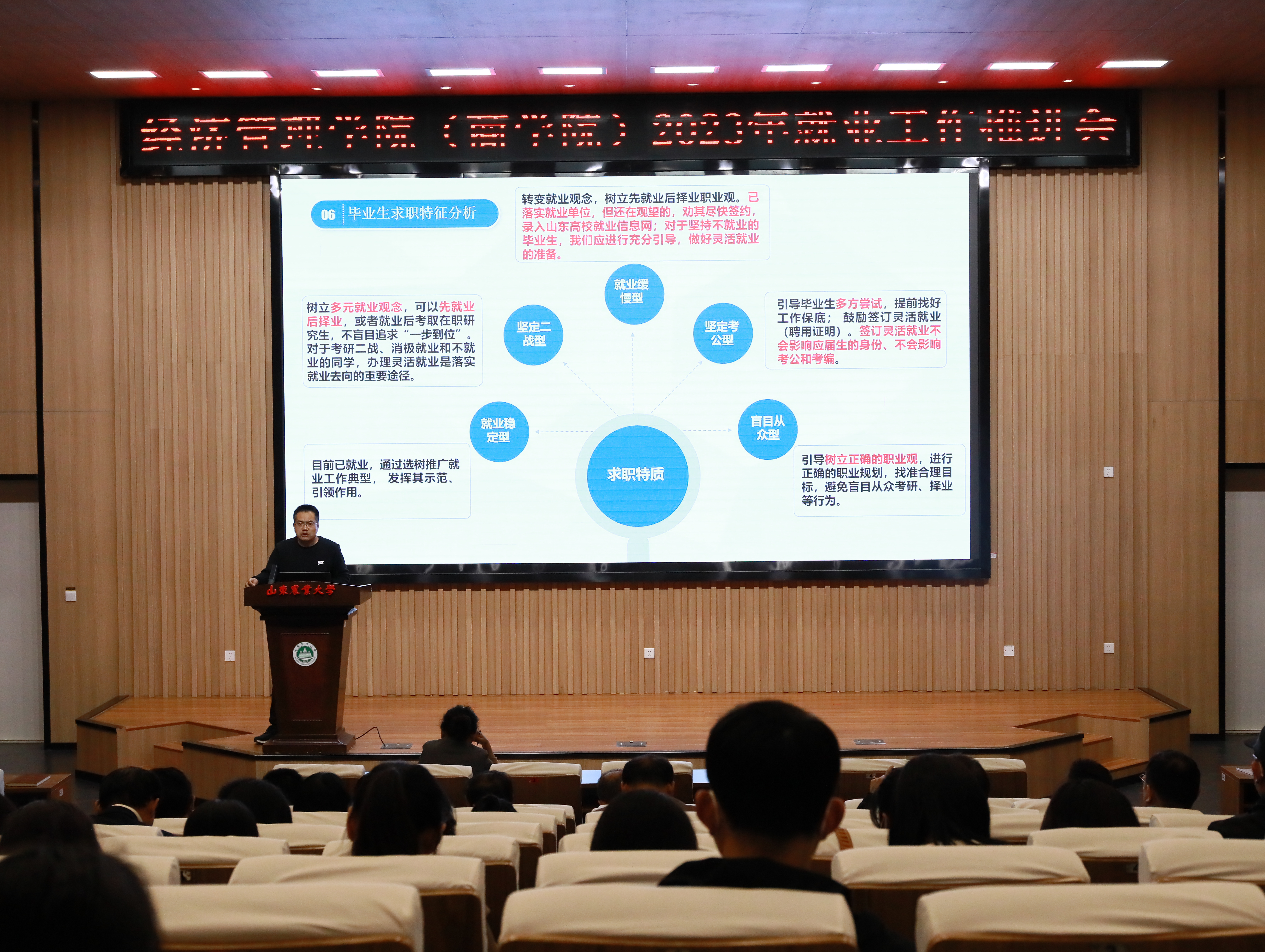 学院党委副书记贾元义分别从2022届毕业生就业工作回顾、2023届毕业生现状、就业形势分析、就业途径及措施、就业目标推进五个方面进行了详细讲解。同时指出,在就业总量压力大和结构性矛盾突出双重挑战的情况下,学院要进一步开展个性化和精准化指导,帮助毕业生充分了解自身优势,为学生号准“就业脉”,把好“职业关”。