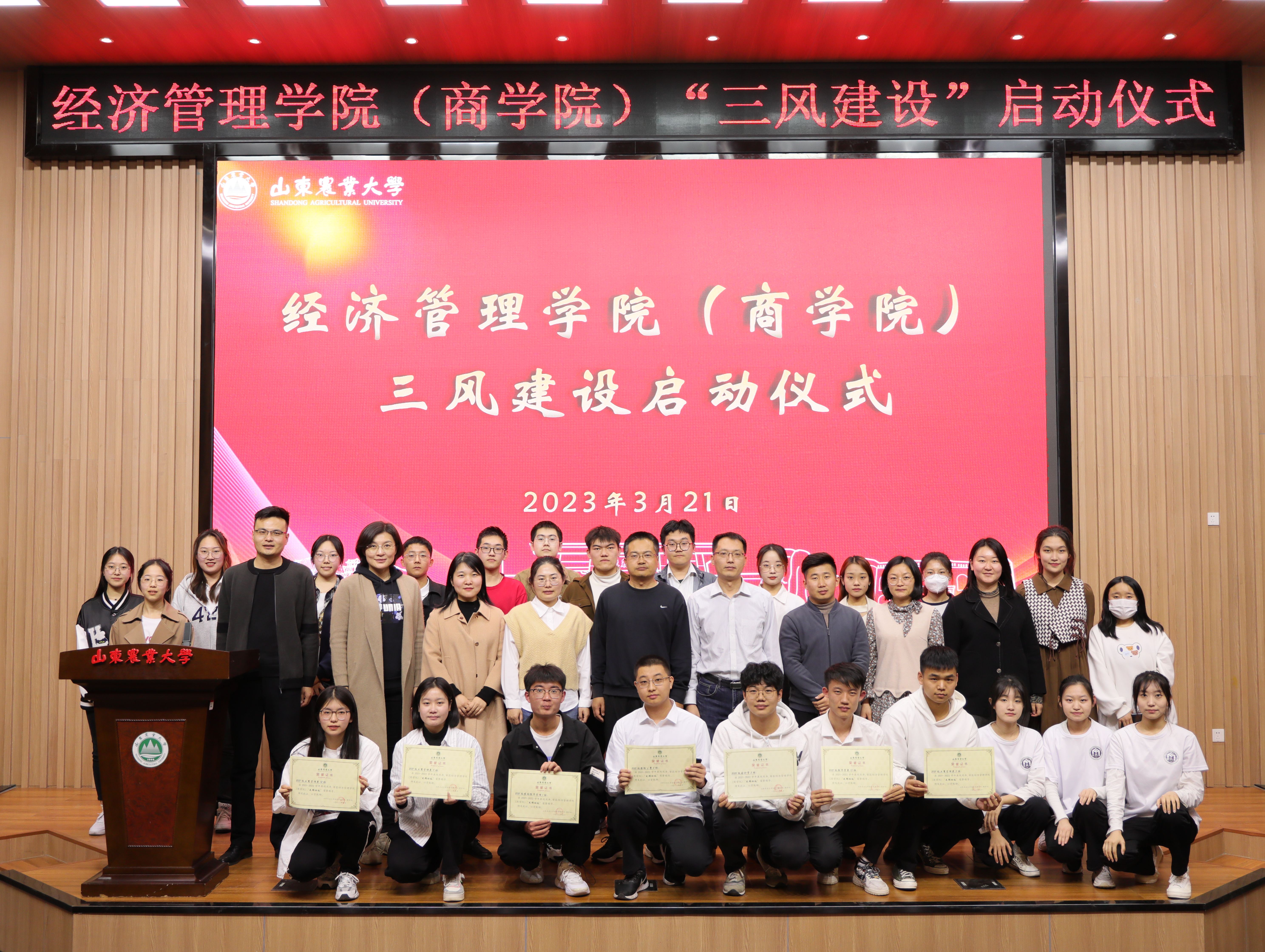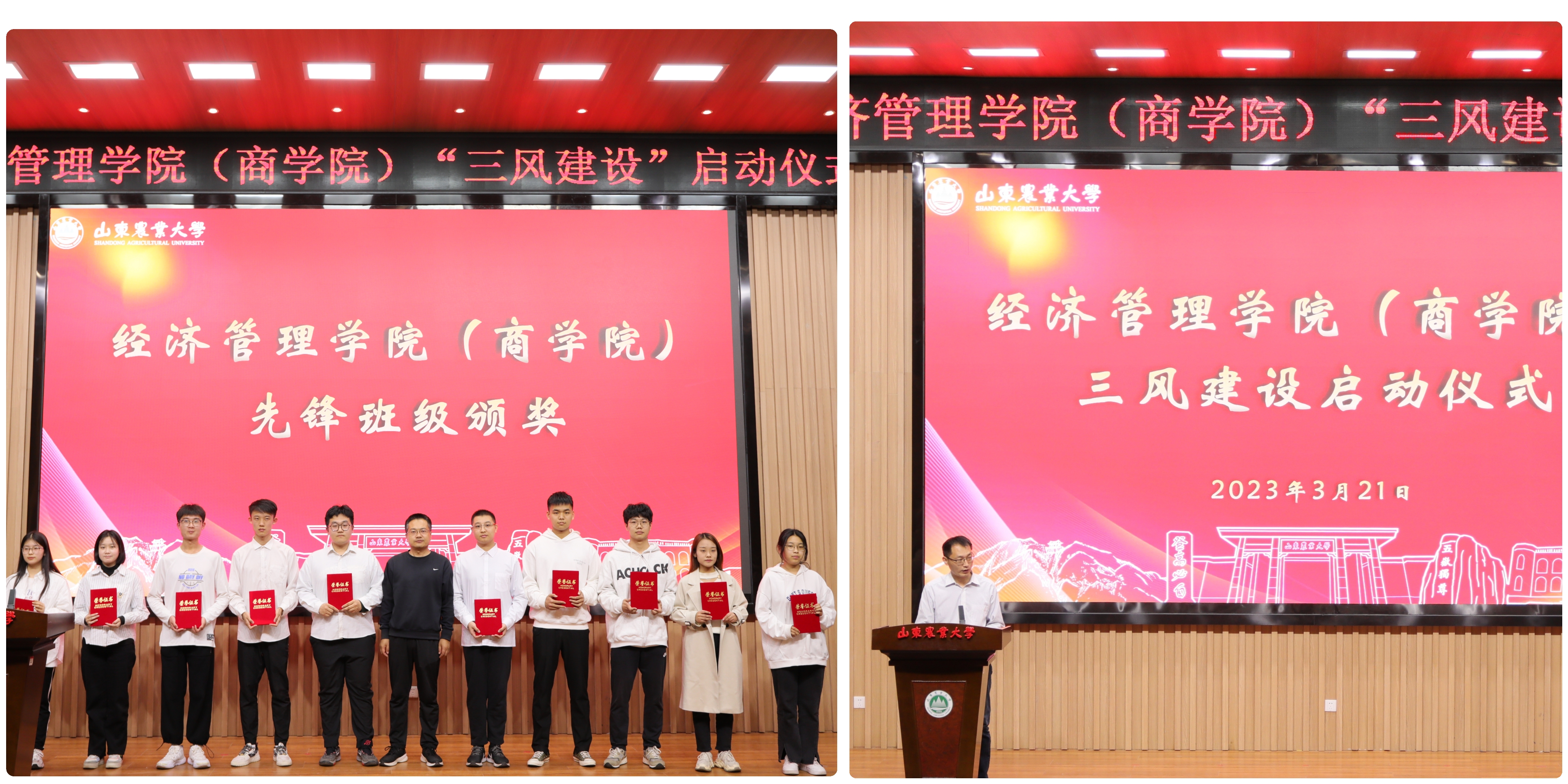 学院团委书记杜洪涛对“三风建设”的具体实施提出倡议。学院党委副书记贾元义为先锋班级颁发荣誉证书。