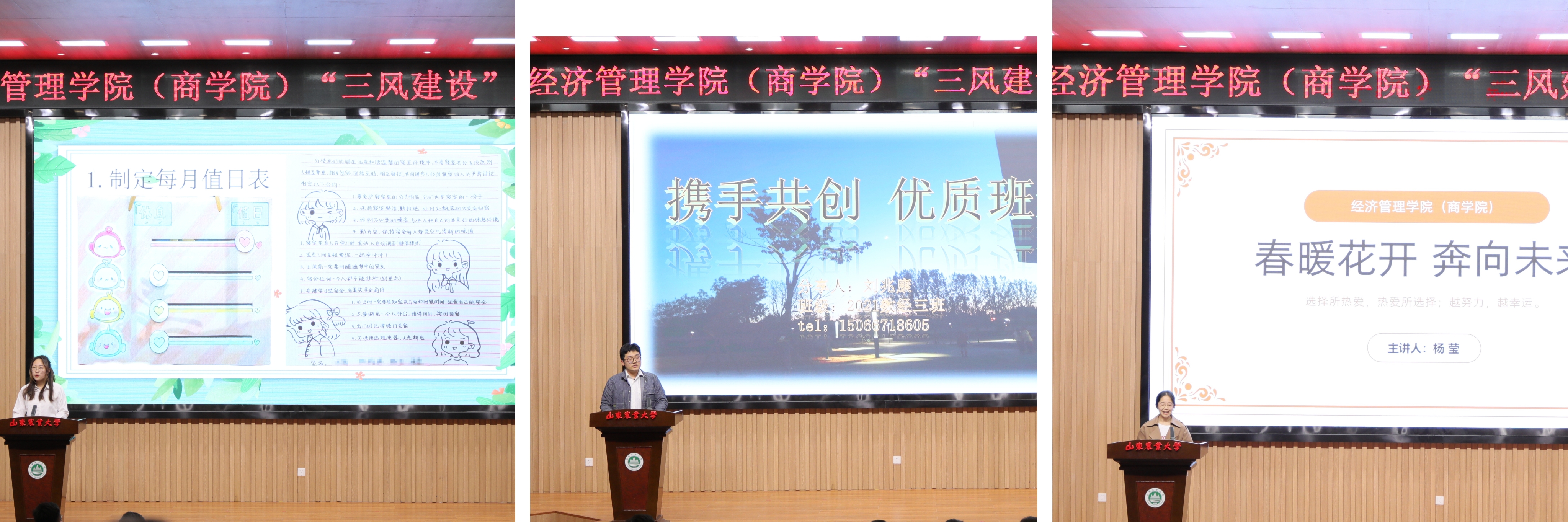 辅导员蒋晨晨以“携手你我共筑新风”为主题,讲述了什么是“三风”、如何建设“三风”,详细解读了“三风建设”考核办法和实施细则,鼓励同学们特色发展、全面发展。