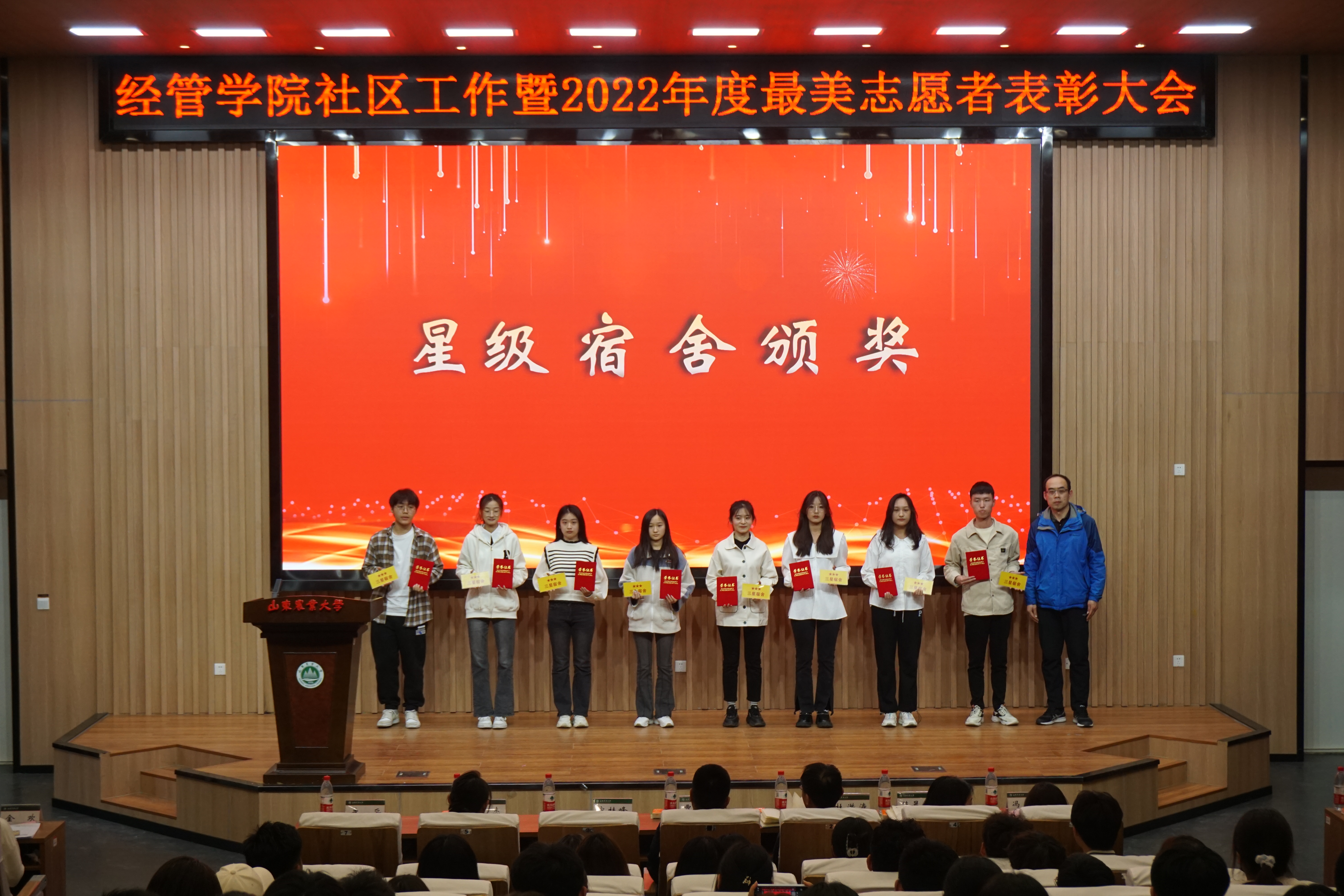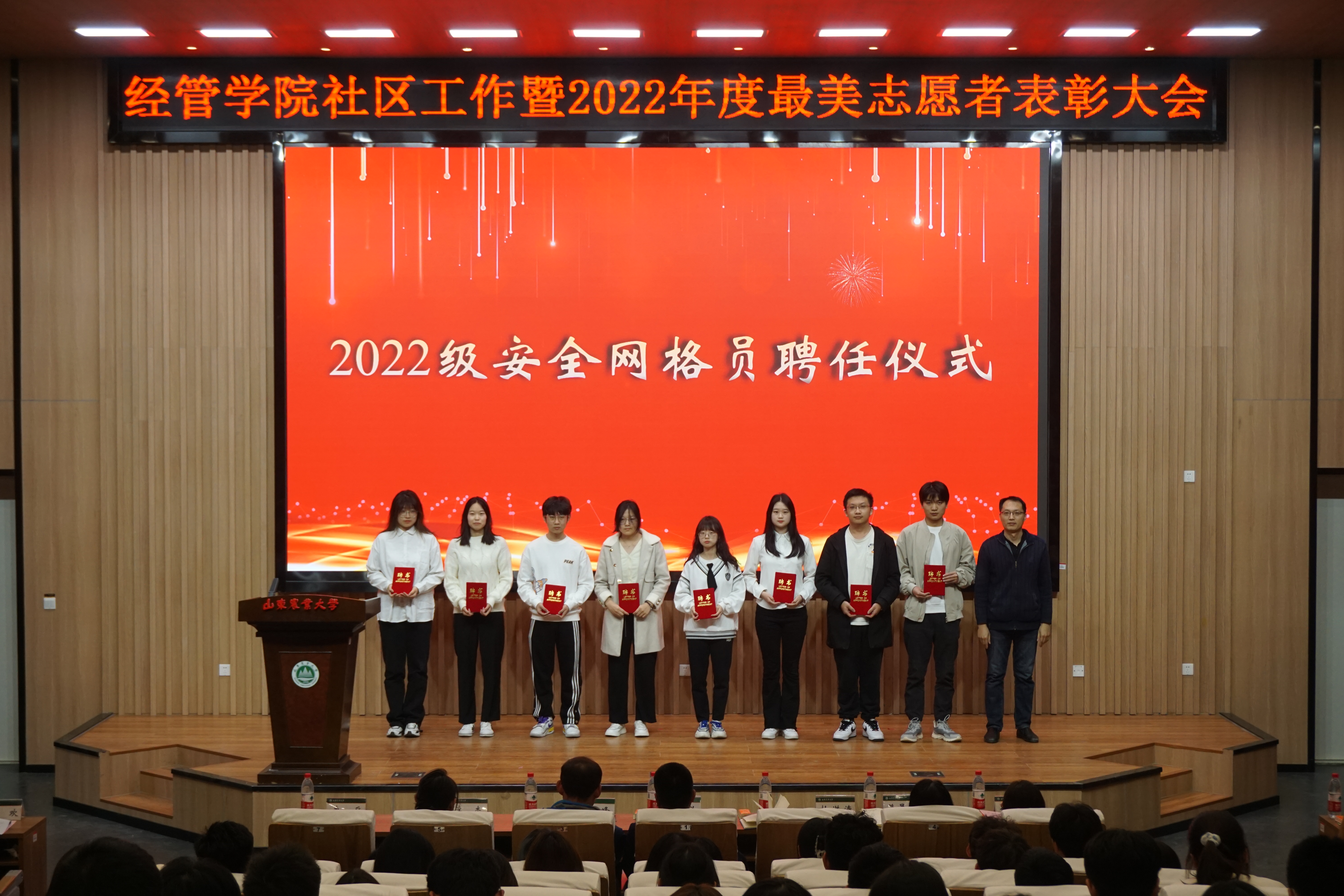 会上,宋桂峰老师为三星宿舍代表颁发证书和星级标牌。杜洪涛老师分别为优秀网格员代表、2022级新聘任安全网格员代表颁发荣誉证书、聘任证书。贾元义老师为2022年度抗击疫情最美志愿者颁发荣誉证书和纪念册。