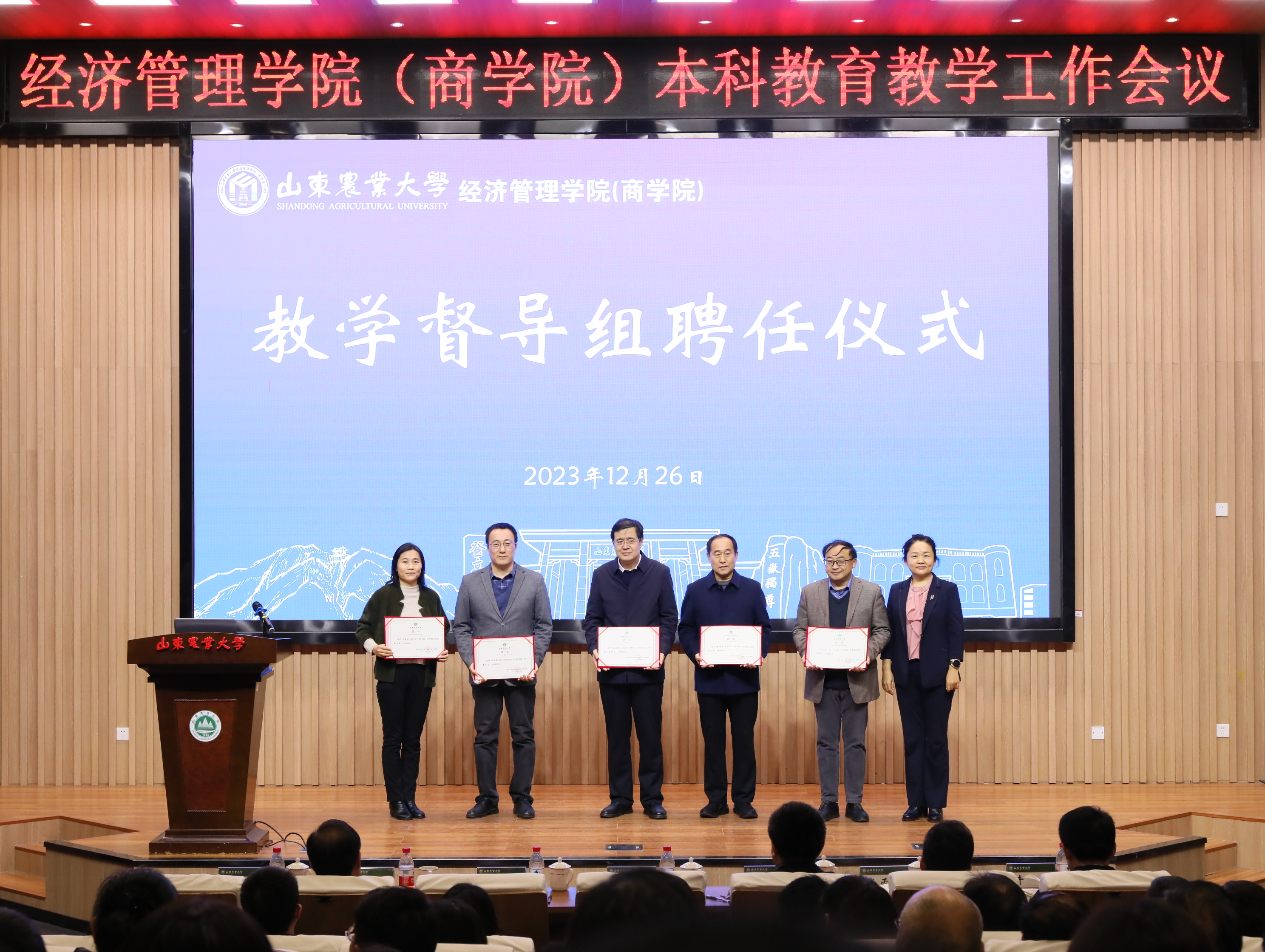 会议开始,学院举行第九届本科教学督导组聘任仪式,学院党委书记齐清为学院第九届教学督导组成员颁发聘书。会上,学院教授委员会副主任郑军、国贸系主任孙兆东、农经系骆乐、团委李妥分别就国家一流本科专业建设、课程建设、青年教师讲课比赛及创新创业赛事指导等方面分享经验。