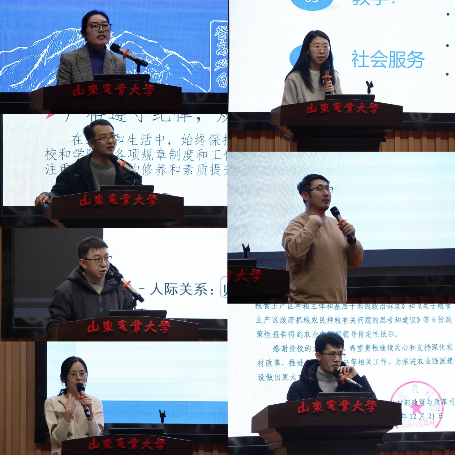 19日下午的“学有所成”--学习培训和个人成长部分由周玉玺院长主持。彭山桂、王美老师介绍了新聘导师夏令营活动的心得体会。李颖、高露老师从教学方法角度分享了学习经历体会。宋晓丽、马宁、贾铖三位老师分课程思政、教学方法、学习借鉴的重要性等角度进行了交流。张印鹏、战略两位老师分别从自身研究方向和具体工作内容角度介绍了经验和未来目标规划。娄承蓉、李政、苏淑仪、陈艺文四位青年教师分享了个人入职以来的心路变化和工作体会。