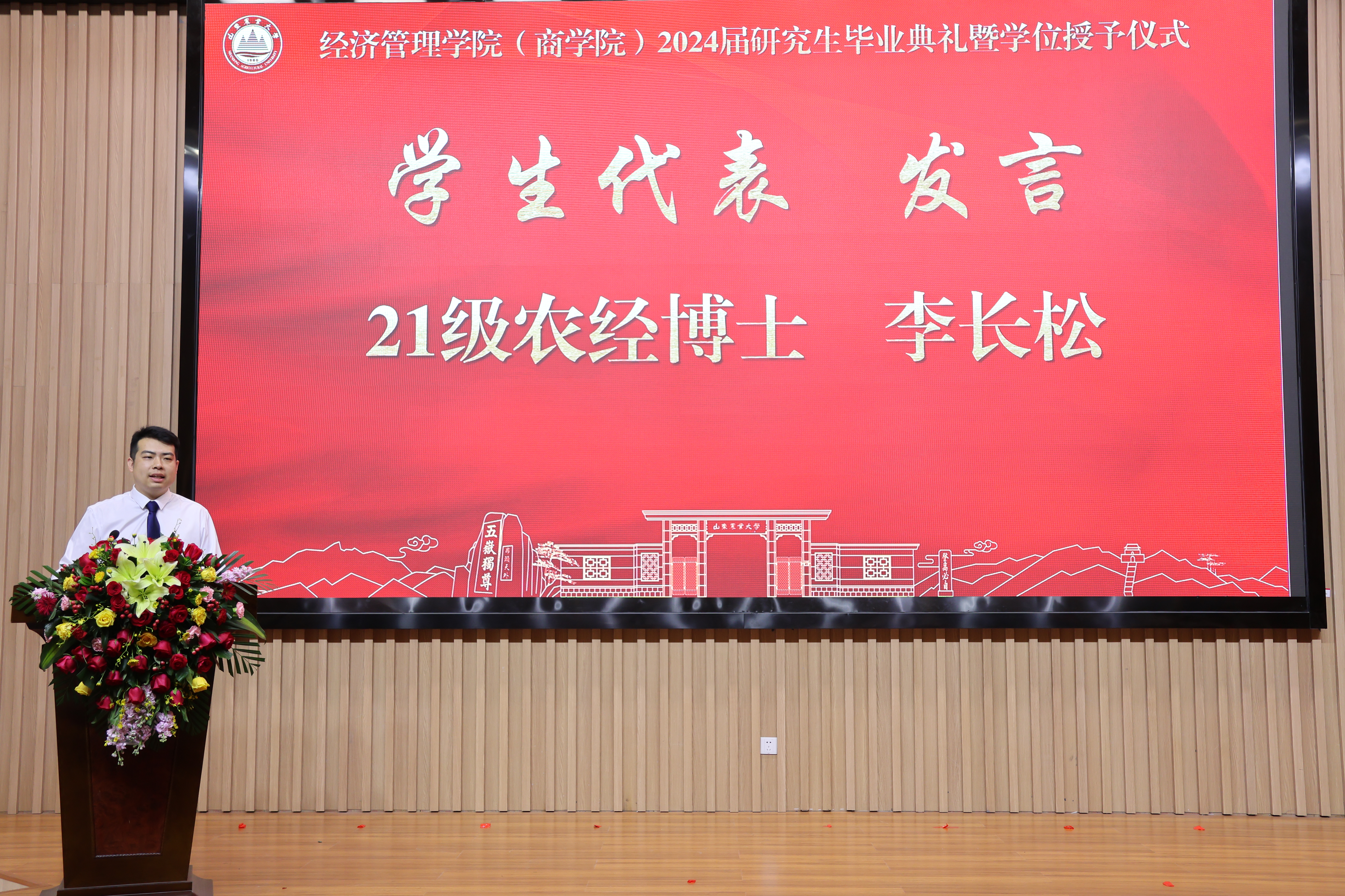 博士毕业研究生代表李长松发言,谈到“老师们的言传身教,不仅让我们在学术上取得了丰硕的成果,更让我们学会坚毅、自强、克制与感恩,在人生道路上受益匪浅。”表示“勇担新时代青年的责任和使命,带着博士阶段的所学所悟,踏上新的征程。”硕士毕业生代表尹春凤在讲话中谈到“感谢大神28预测网站给我们提供了学习求知的环境,给我们提供了展现自我的空间。”她承诺“在未来的发展过程中,我们要继续发扬实践精神,从实践中来到实践中去,把论文写在祖国大地上,为实现国家的农业强国建设贡献我们农大学子的一份力量。”