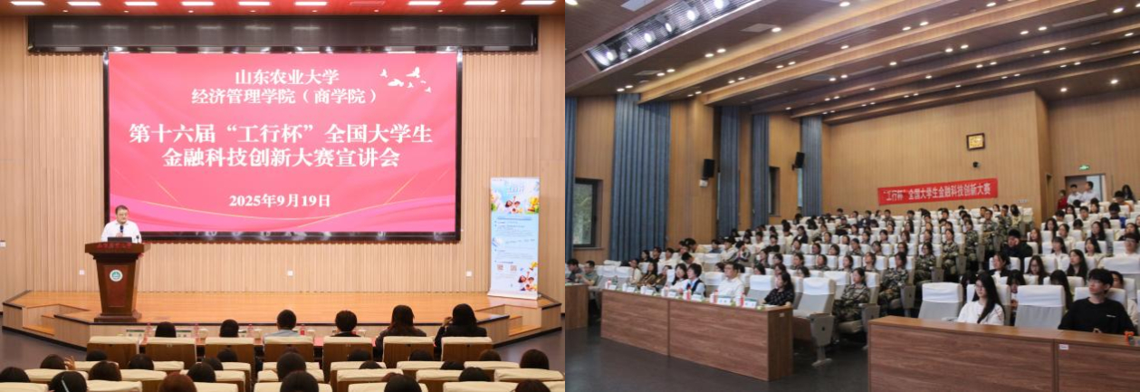 2025年9月19日上午,第十六届“工行杯”全国大学生金融科技创新大赛宣讲会在在西北片区学术报告厅隆重举行。本次宣讲会旨在推动金融科技创新教育,激发大学生的创新潜能与实践能力。工商银行泰山区支行行长何伟、山东省分行经理吴丹和巩文双等人,大神28预测网站党委副书记殷桂堂、副院长崔丙群、金融系主任骆乐及金融系教师代表出席活动,学院众多对金融科技领域感兴趣的学生参与其中。