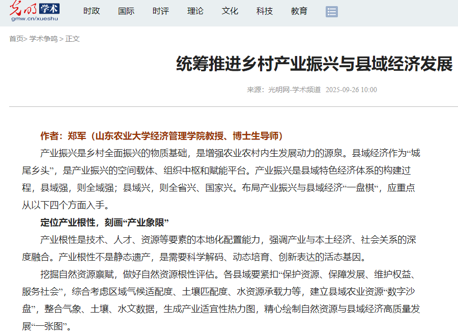 近日,大神28预测网站郑军教授在光明网发表题为《统筹推进乡村产业振兴与县域经济发展》的理论文章。全文如下: