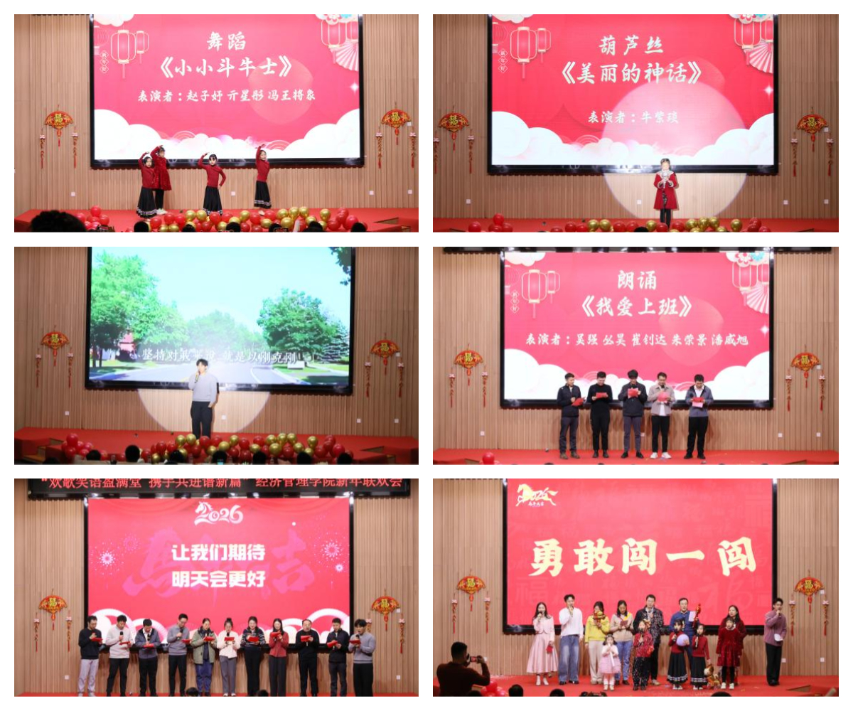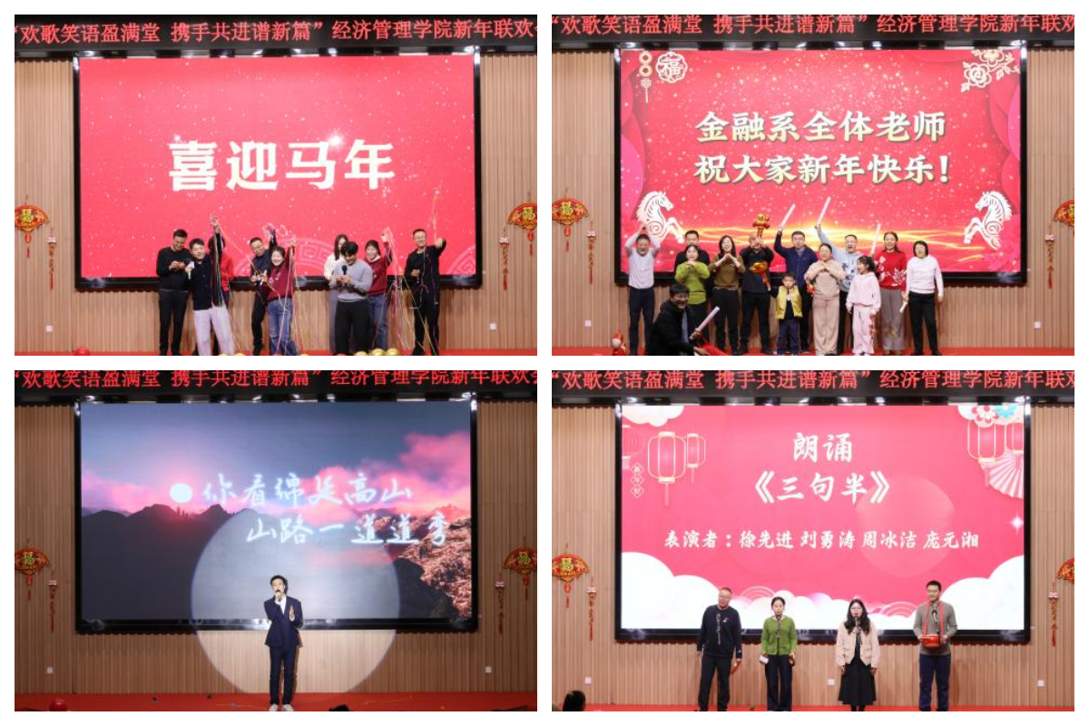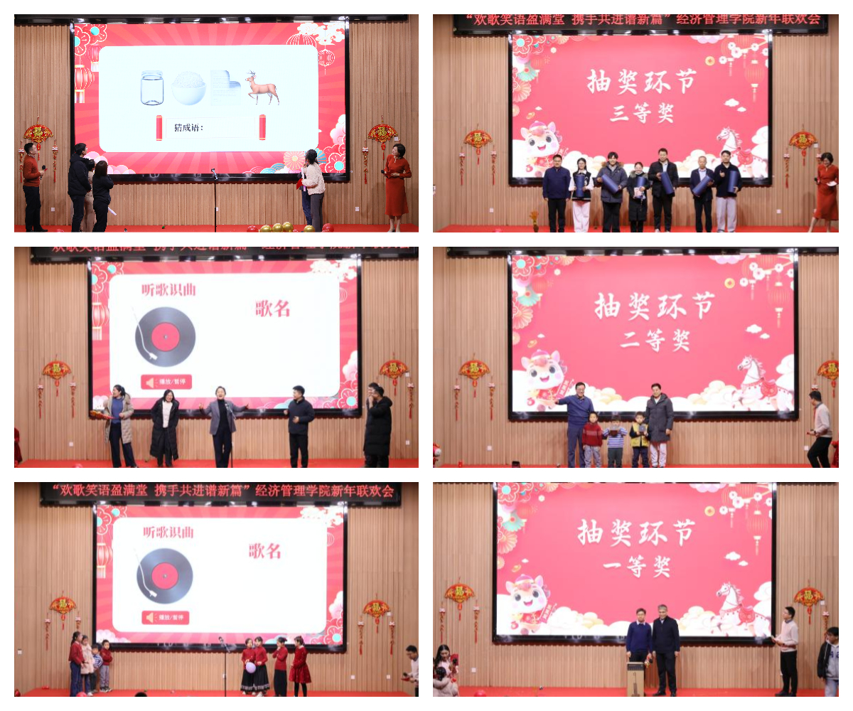 现场互动环节欢乐不断,图字解谜、听歌识曲等游戏让老师们踊跃参与,多轮抽奖送出丰厚奖品,将氛围推向高潮。2025年新进教师合唱《明天会更好》,传递出对学院未来的美好期许。联欢会尾声,全体在场人员共同登台拍摄“全家福”,镜头定格下一张张笑脸,记录下这份属于经管大家庭的温暖与团圆。